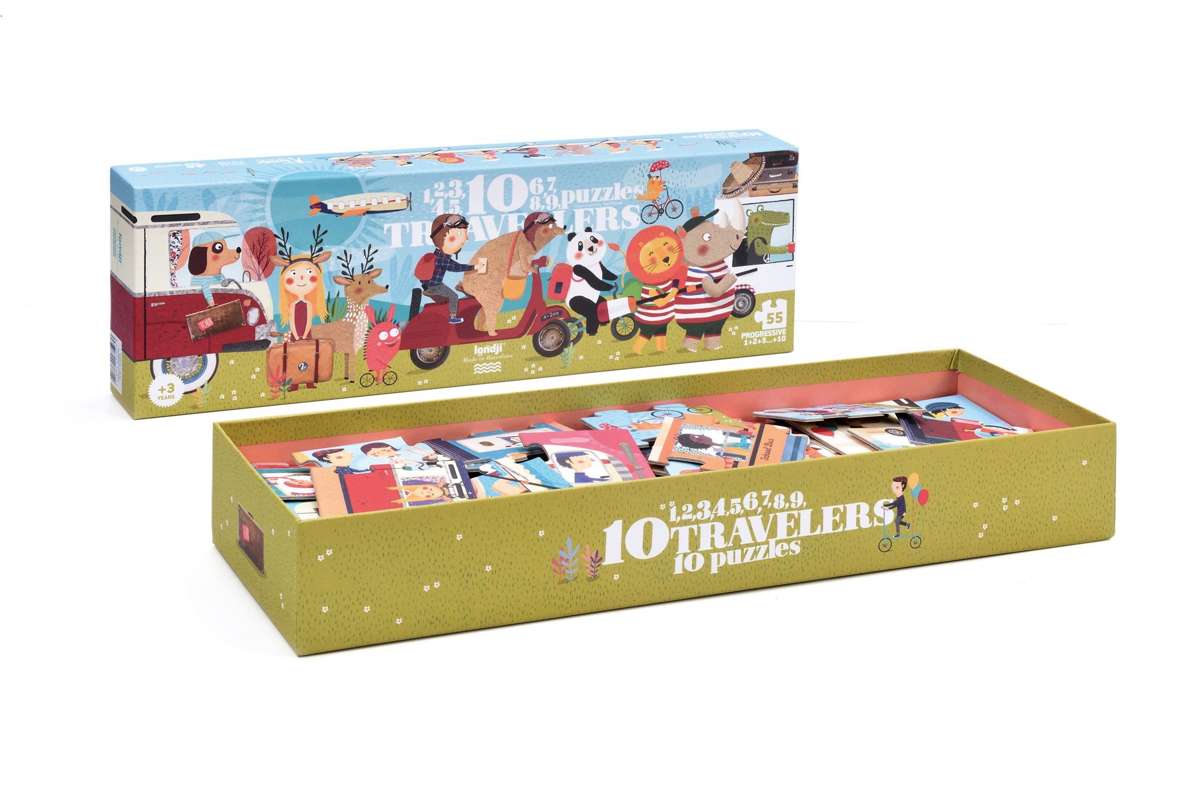 10 aufsteigende Puzzles, mit den verschiedenen Transportmitteln, von 2 Teilen bis zu 10. Eine unterhaltsame Möglichkeit, das Zählen zu lernen.