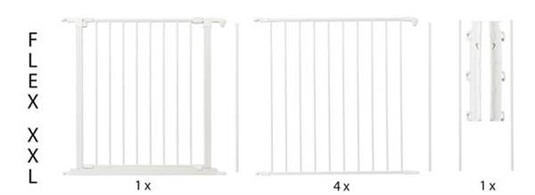Flex XXL besteht aus einem zu öffnenden Tor (72 cm), fünf 72 cm breiten Paneelen und Wandhalterungen. Das Tor und die Paneele können in jedem ausgerichtet werden Kombination und Winkel. Kann mit einer unbegrenzten Anzahl von Paneelen aufgerüstet werden (33 cm und 72 cm Breite verfügbar). Kann mit einer unbegrenzten Anzahl von Toren aufgerüstet werden (72 cm Breite). Flex XXL kann für den Schutz breiter Treppen oder Durchgänge verwendet werden. Einsetzbar für Durchgänge von 90 bis 350 cm Breite. Einfaches Schließen und Öffnen mit mit einer Hand. Außergewöhnlich einfache Montage und Demontage. Wenn die Wandhalterungen befestigt sind, dauert die Montage und Demontage nur wenige Sekunden. Erfordert Bohren (keine Dübel im Set!). Zusammenklappbar, um den Platzbedarf bei Nichtgebrauch zu reduzieren. 71 cm groß. Geeignet für Kinder bis 2 Jahre. Erfüllt die europäische Sicherheitsrichtlinie EN 1930:2011 Hergestellt in Dänemark 2 Jahre Garantie