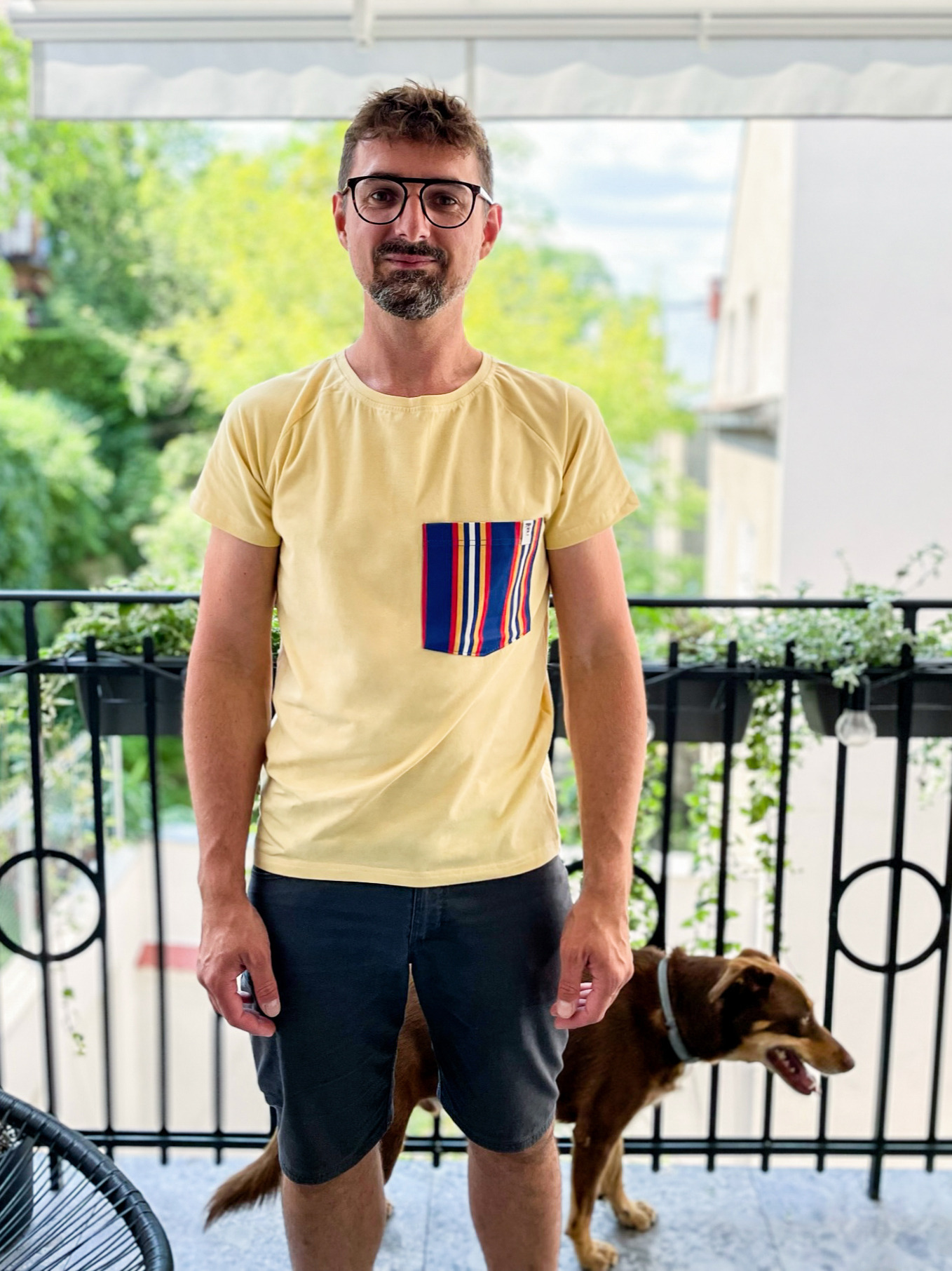 Es gibt keinen Sommer ohne Pastellfarben! Das gelbe T-Shirt mit einem milchigen Farbton ruft die schönsten Urlaubserinnerungen hervor: Sonne, Sand und lange, warme Abende voller Spaß. Ergänzt durch eine kontrastierende Tasche mit einem Folkloremotiv aus Streifen wird es das Lieblingsstück der Sommergarderobe für Kind und Elternteil.