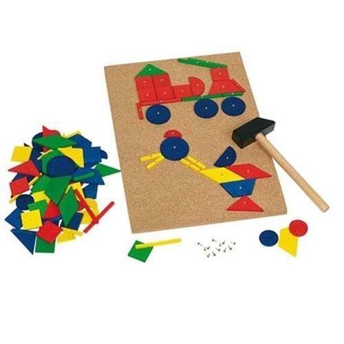 Das Set enthält 102 Teile zum Erstellen von Formen mit farbenfrohen Figuren. Mit einem Hammer sollten sie an die Korkplatte genagelt werden, und Bilder entstehen je nach Ihrer Vorstellungskraft.