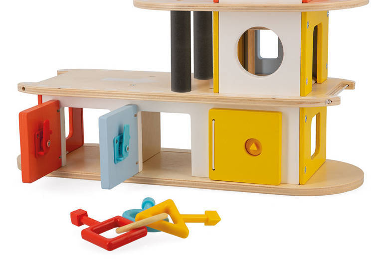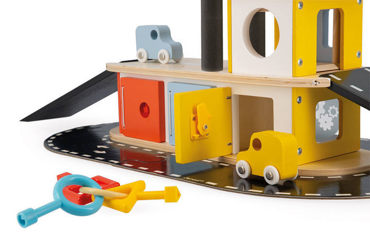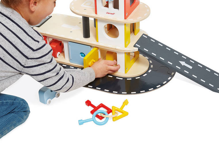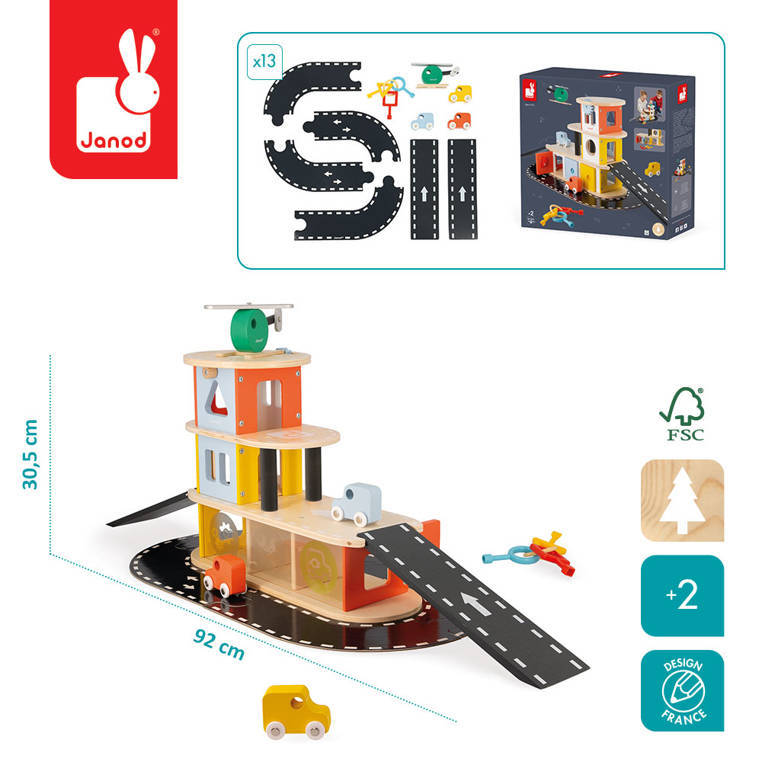 Eine zweistöckige Holzgarage aus der Bolid-Serie der französischen Marke JANOD ist das perfekte Geschenk für jedes Kind. Das Set besteht aus einer mehrstöckigen (3 Etagen!) Garage mit Zubehör: 3 Autos und einem Hubschrauber. In der untersten Etage befinden sich drei Boxen, die mit den mitgelieferten Kunststoffschlüsseln in verschiedenen geometrischen Formen geöffnet werden können (Sortierfunktion). Das Gebäude verfügt über zwei Rampen, einen mechanischen Aufzug (mit Zahnrad) und einen Hubschrauberlandeplatz. Mit dem Set können Sie viele Spielszenarien erstellen. Das Spielzeug wurde in Frankreich entworfen. Perfekt als Geschenk.