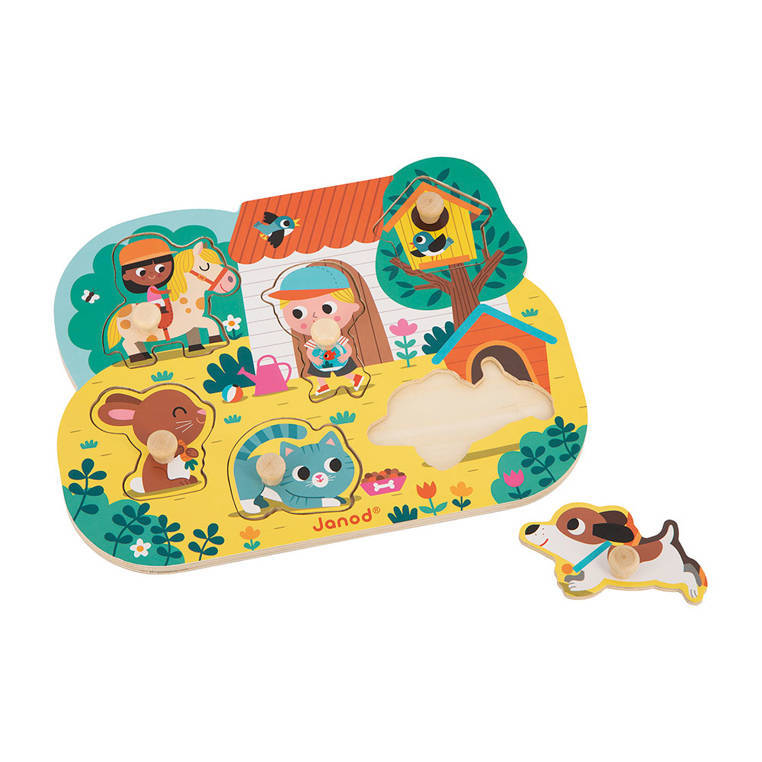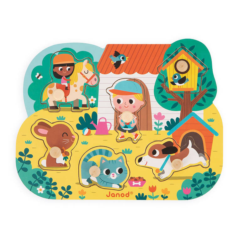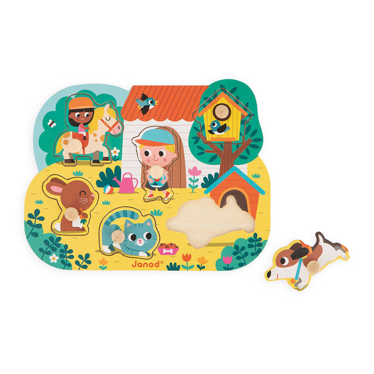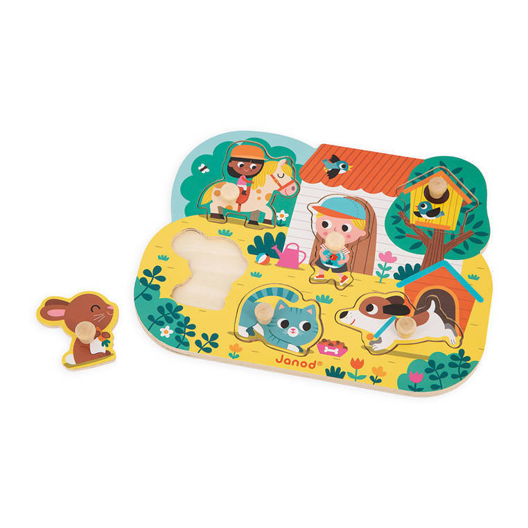 Holzpuzzles „Auf dem Land“ der französischen Marke JANOD sind ein tolles erstes Puzzle für Kleinkinder. Das Set besteht aus 7 Elementen: 6 Holzformen – ein Mädchen auf einem Pferd, ein Junge mit Aquarium, ein Vogelhaus, ein Hund, ein Kätzchen und ein Kaninchen – und 1 Holzbrett in einem ländlichen Hain (einschließlich eines Hauses, Bäumen usw.). eine Hundehütte) und mit Aussparungen in der Form der genannten Figuren/Dinge. Die Aufgabe des Kindes besteht darin, die Elemente den entsprechenden Stellen auf der Tafel zuzuordnen. Spezielle Griffe an jedem von ihnen erleichtern kleinen Händen das Spielen. Ein solches Puzzle ist der perfekte Einstieg in echte Rätsel.