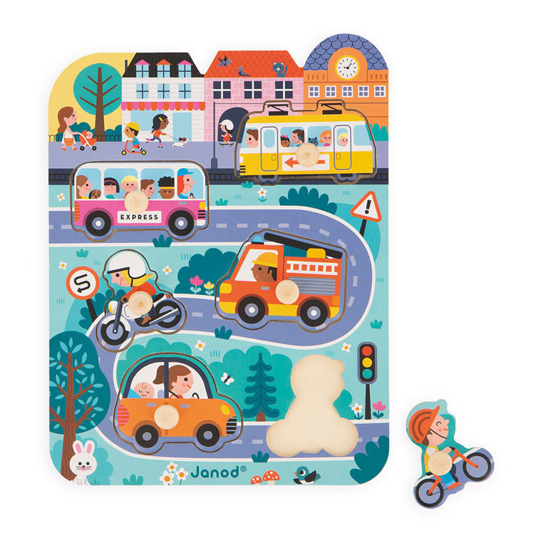 Holzpuzzles in der Stadt der französischen Marke JANOD sind ein tolles erstes Puzzle für Kleinkinder. Das Set besteht aus 7 Elementen: 6 Holzfahrzeugen – einer Straßenbahn, einem Bus, einem Motorrad, einem Fahrrad, einem Personenkraftwagen und einem Feuerwehrauto – und 1 Holzbrett in Form einer Stadt (einschließlich Straße, Gleis und Gehweg) und mit Rezessionen in Form der oben genannten Transportmittel. Die Aufgabe des Kindes besteht darin, die Elemente den entsprechenden Stellen auf der Tafel zuzuordnen. Spezielle Griffe an jedem von ihnen erleichtern kleinen Händen das Spielen. Ein solches Puzzle ist der perfekte Einstieg in echte Rätsel.