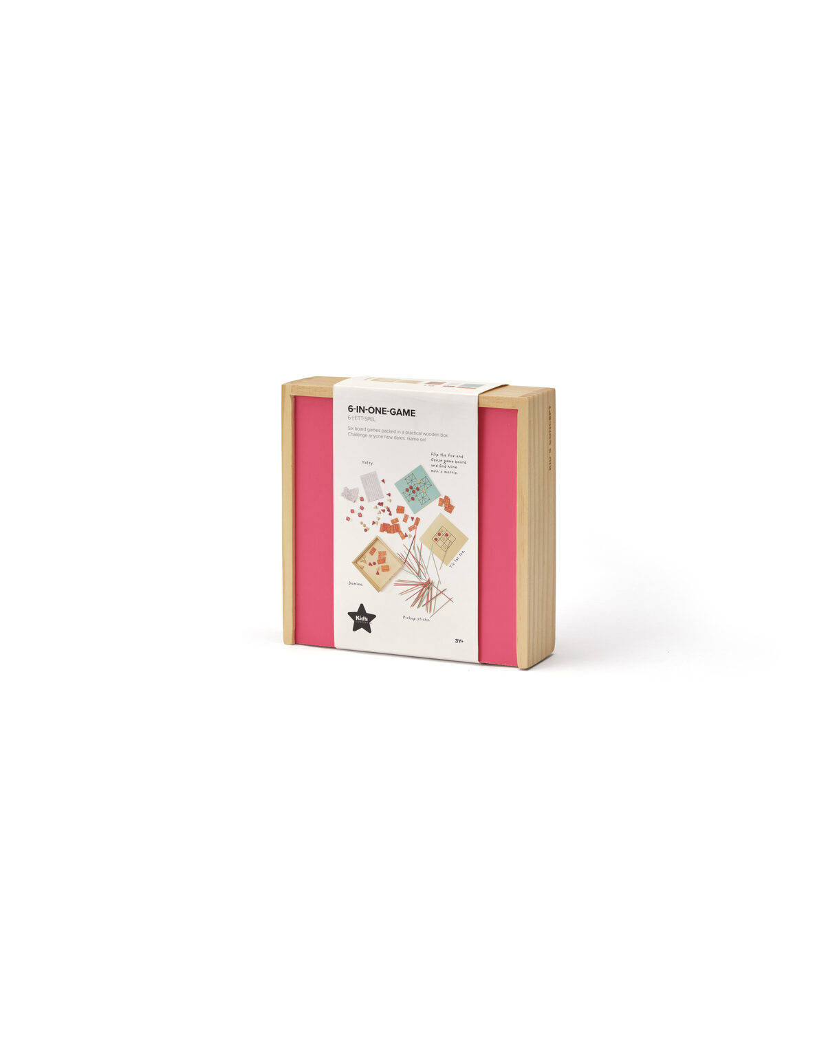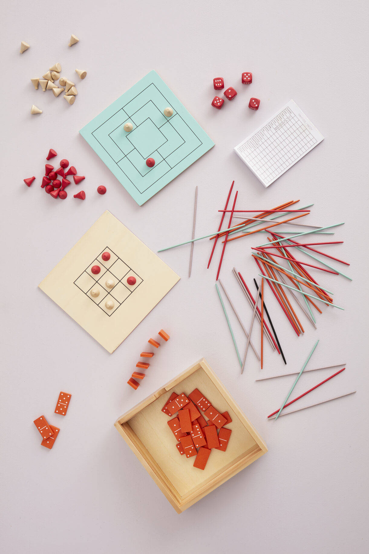 Die Holzkiste enthält sechs beliebte Spieleklassiker: Dominosteine, Pickup-Stöcke, Tic Tac Toe, Yatzy, Nine Men's Morris und das Fuchs-und-Gänse-Spiel. Enthält außerdem fünf Würfelsätze und 40 Spielsteine: 20 in Neutral und 20 in Rot.