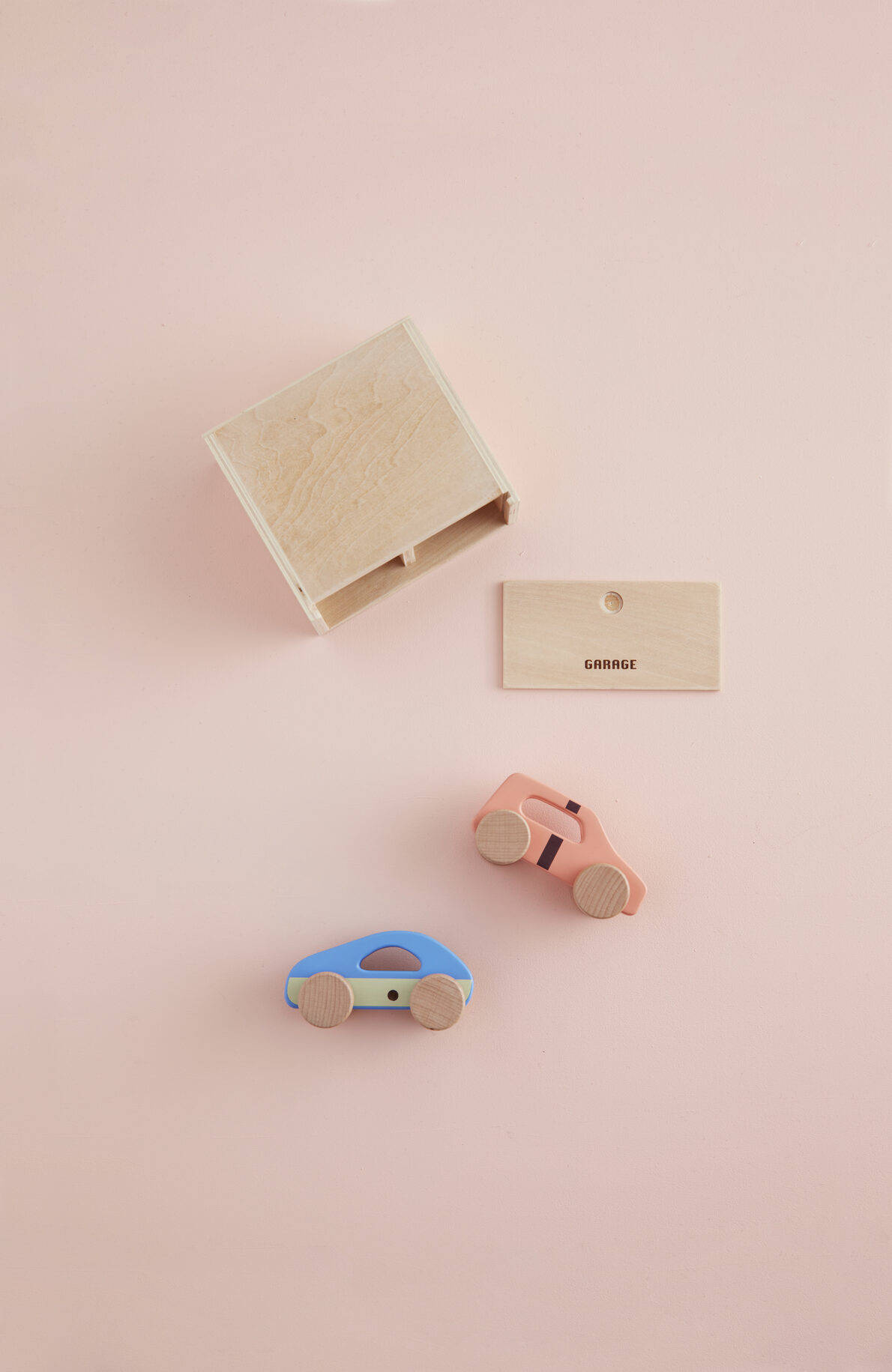 Das Set beinhaltet eine Holzgarage mit Platz für zwei Fahrzeuge.