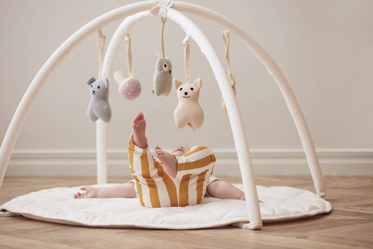 Ein klassisches cremefarbenes Baby-Fitnessstudio aus schönem, dickem Baumwoll-Canvas, das Sie mit jedem unserer Baby-Fitnessspielzeuge Ihrer Wahl kombinieren können.