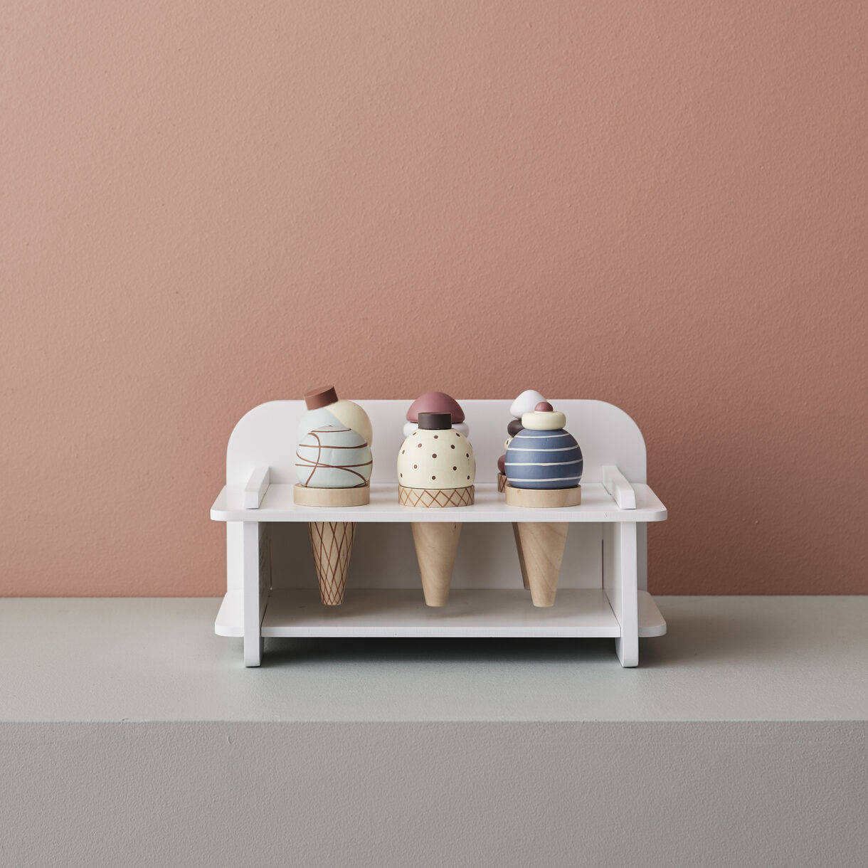 Der Ständer ist weiß und in sanften Farben gehalten und die Eissorten sind so gestaltet, dass sie wie verschiedene Eissorten aussehen. Perfekt für den Verkauf im Rollenspielladen.