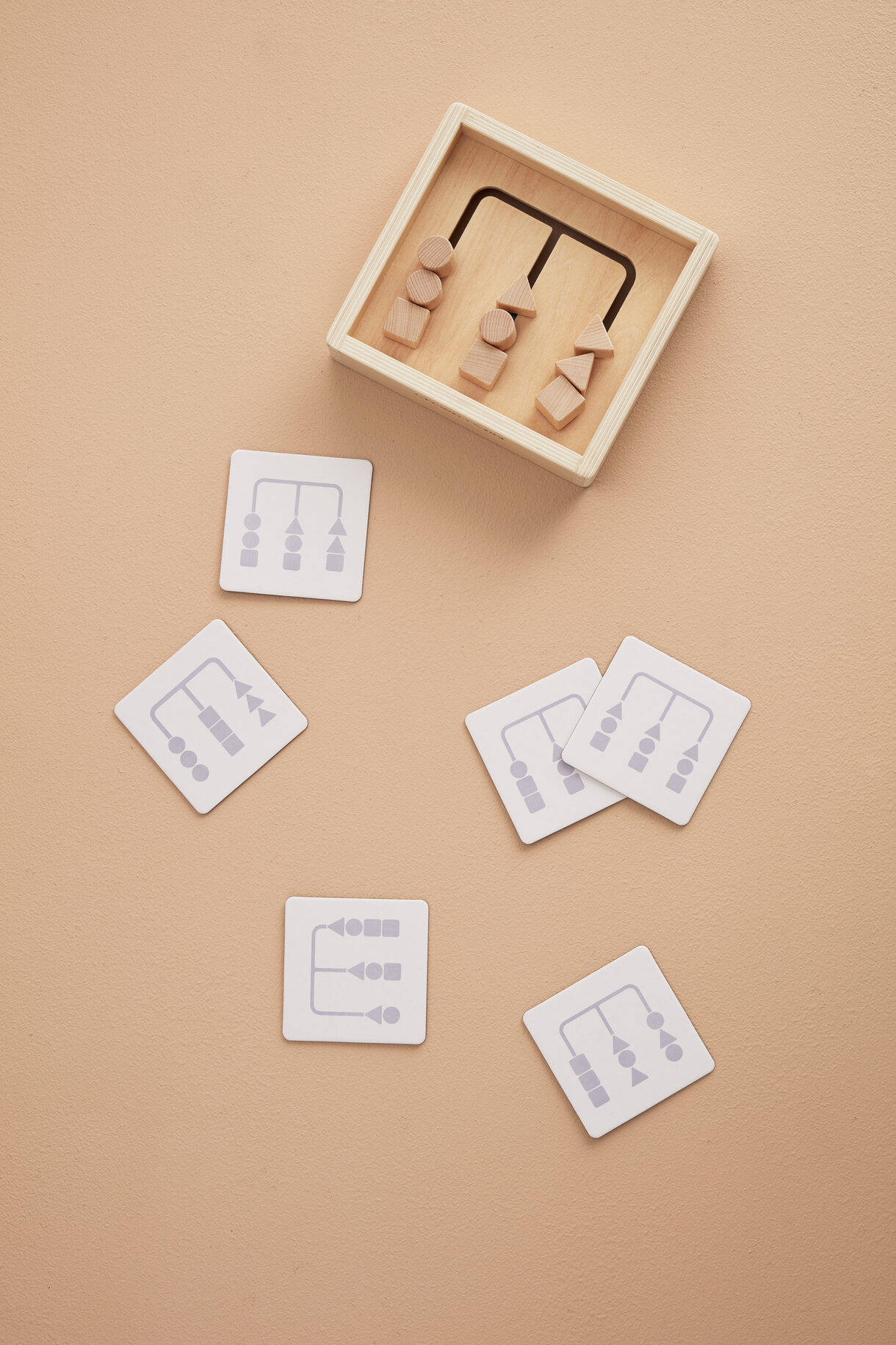 Dieses doppelseitige Labyrinth hat auf der einen Seite farbige Perlen und auf der anderen geometrische Figuren.