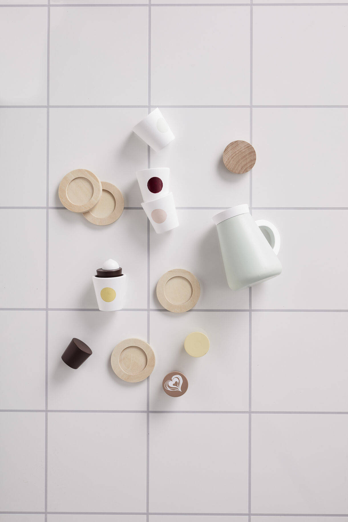Dieses FIKA-Holzset enthält eine Thermoskanne mit abnehmbarem Deckel, 4 verschiedene Tassen und zylindrische Getränkeblöcke, die in die Tassen passen. Zur Auswahl stehen schwarzer Kaffee, Milchkaffee, heiße Schokolade mit Schlagsahne und Tee. Füllen Sie Tassen mit verschiedenen Getränken und machen Sie eine Kaffeepause mit Freunden oder bieten Sie Mama und Papa etwas zu trinken an.