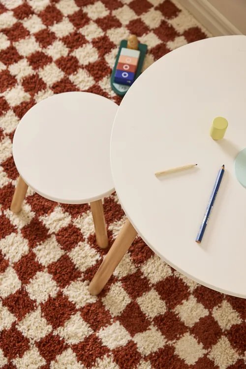 Kindermöbelset mit harter, kratzfreier Oberfläche, die widerstandsfähig und leicht zu reinigen ist. Die Tischplatte und die Sitzfläche des Hockers sind etwas dicker und haben einen größeren Durchmesser als die meisten auf dem Markt erhältlichen Modelle.