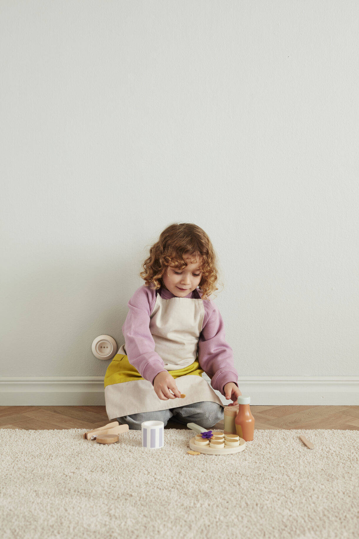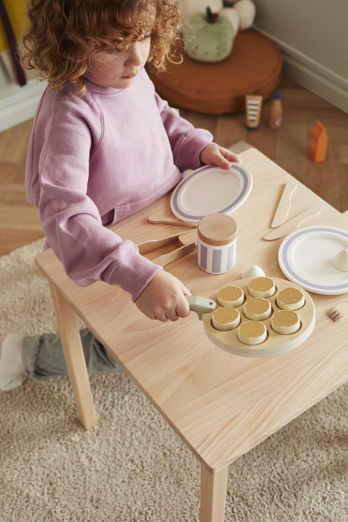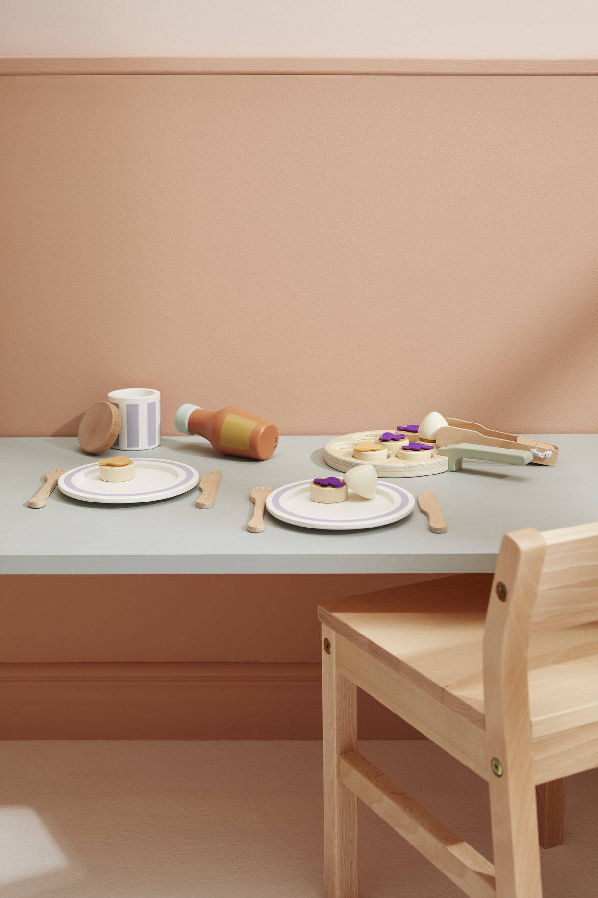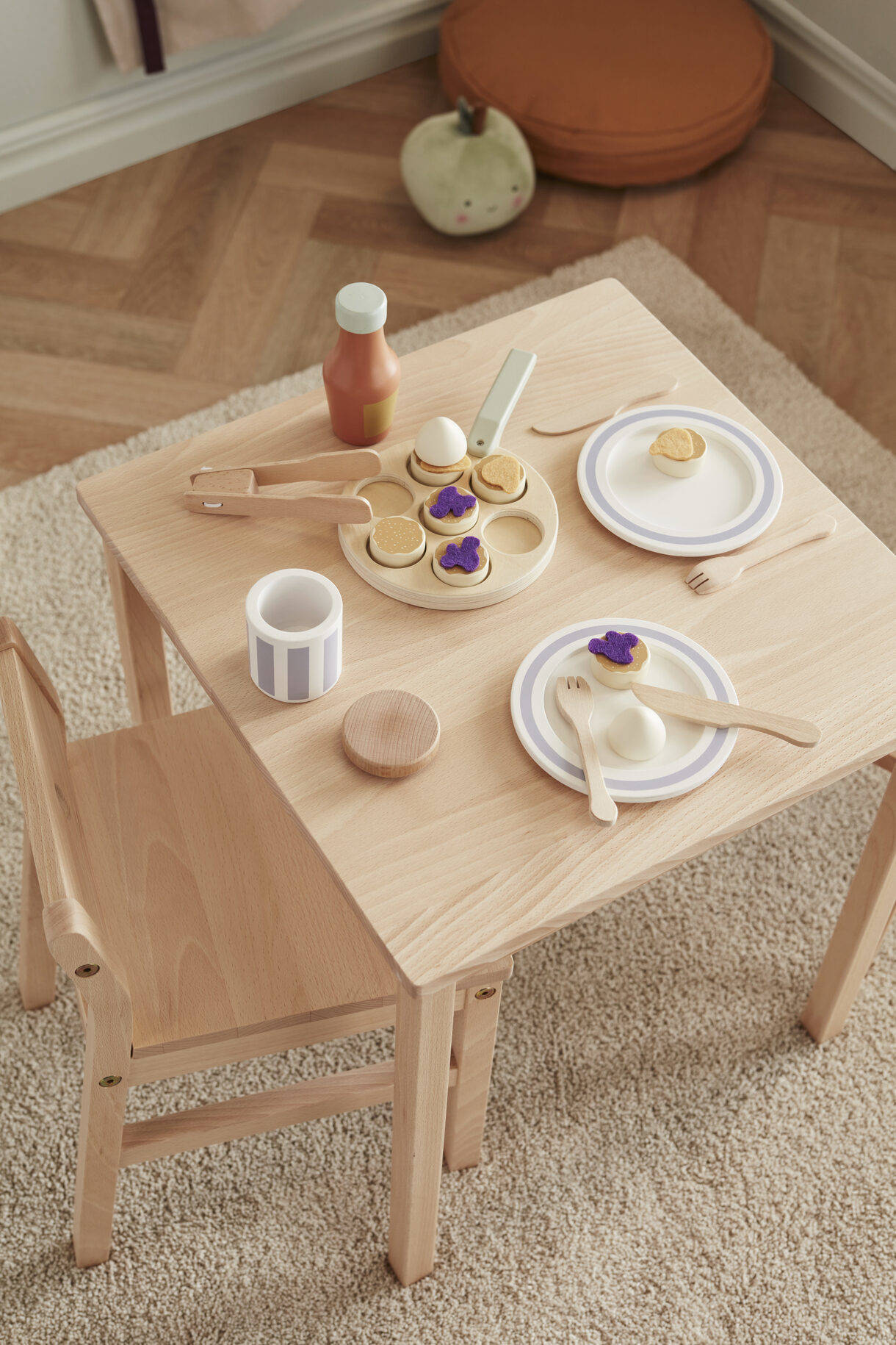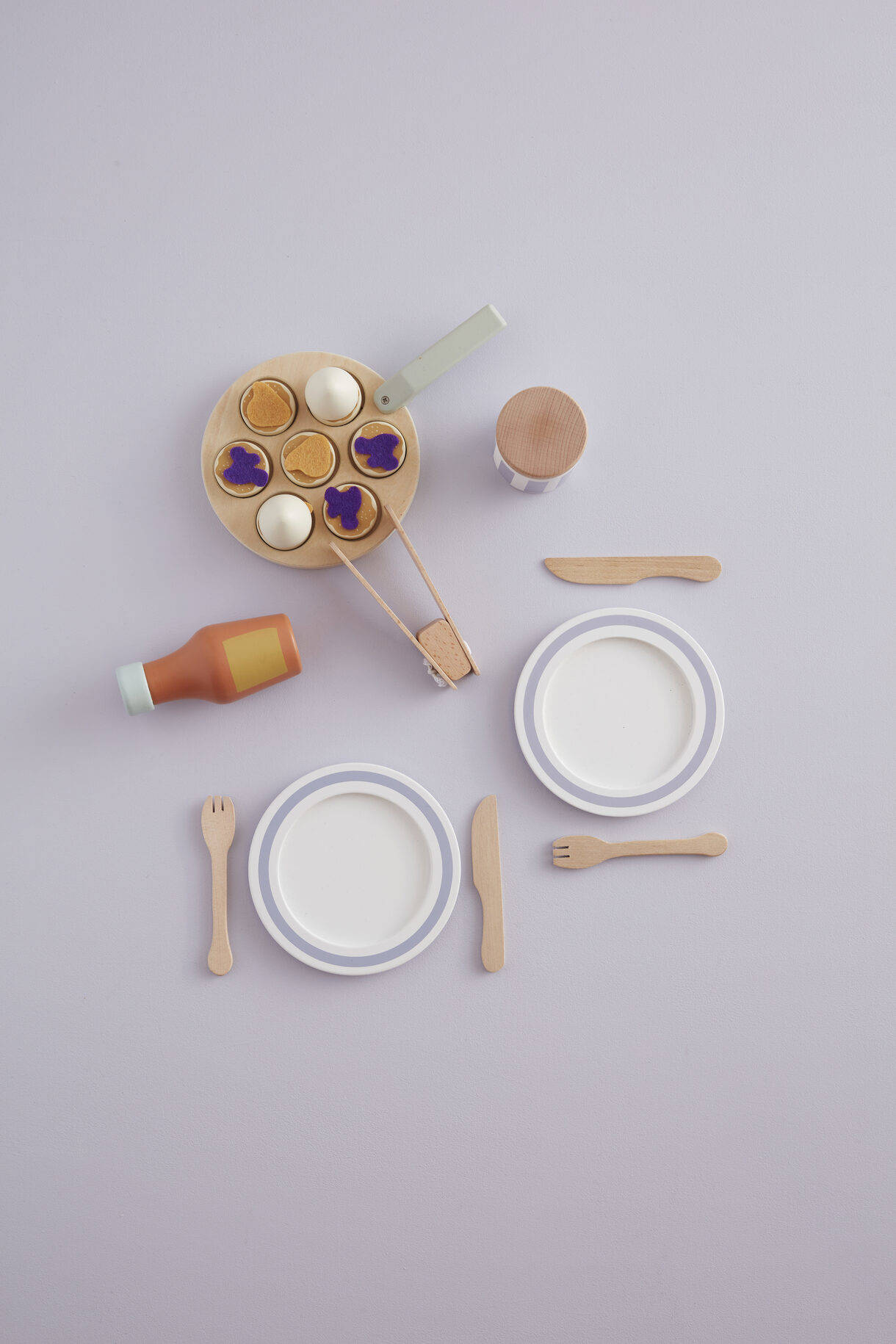 - Bratpfanne: Sperrholz Marmeladenglasdeckel, Küchenutensilien: Birke Schlagsahneportionen, Flasche: Schima Teller, Pfannkuchen: MDF Marmeladenportionen: Polyester