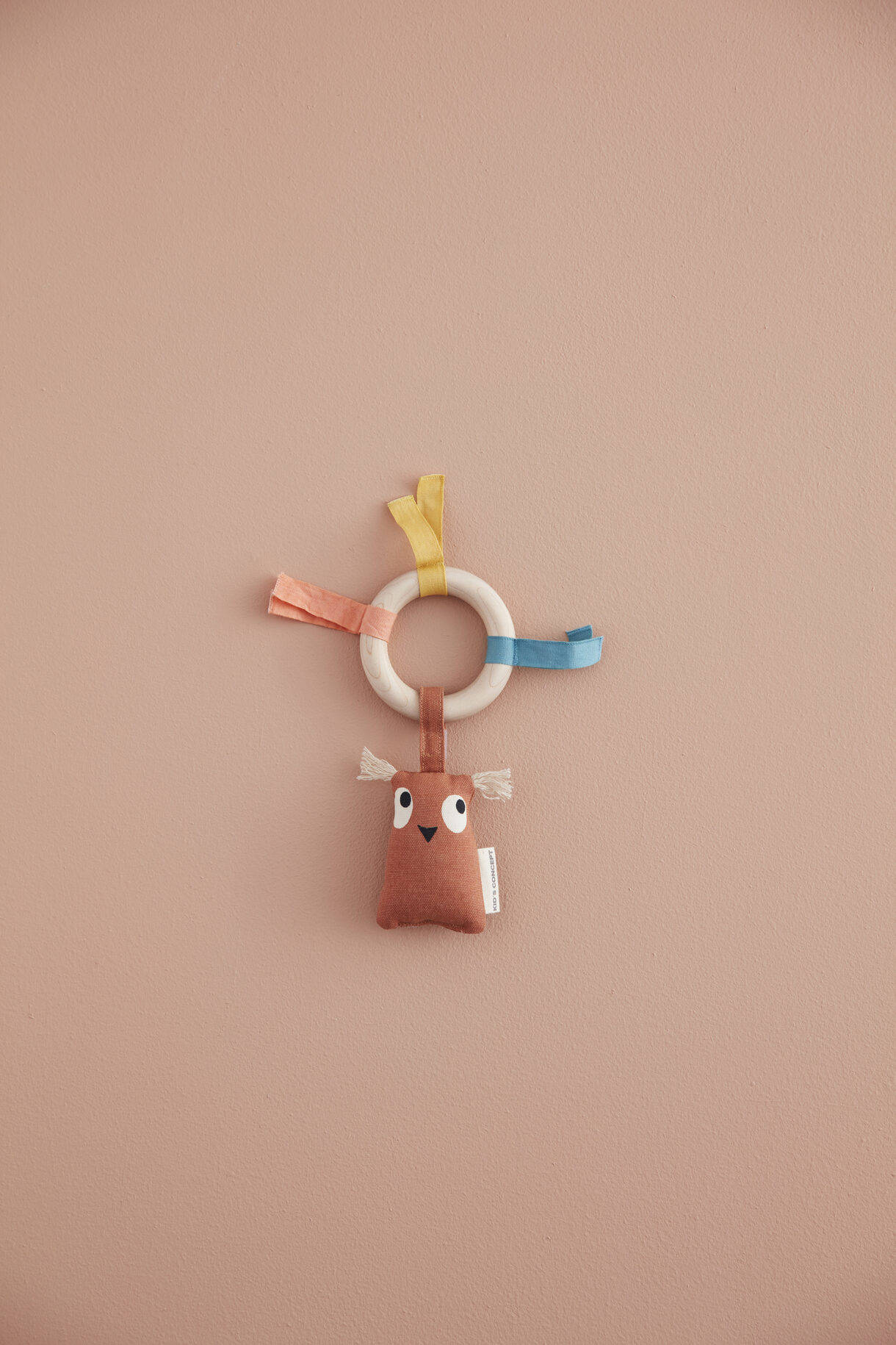 Elemente mit unterschiedlichen Texturen: ein Holzring aus FSC-zertifiziertem Buchenholz – zum Beißen, Greifen und Spielen, bunte Bänder und ein weiches Eule stimuliert die Sinne und wirkt sich positiv auf die sensorische Entwicklung Ihres Kindes aus.