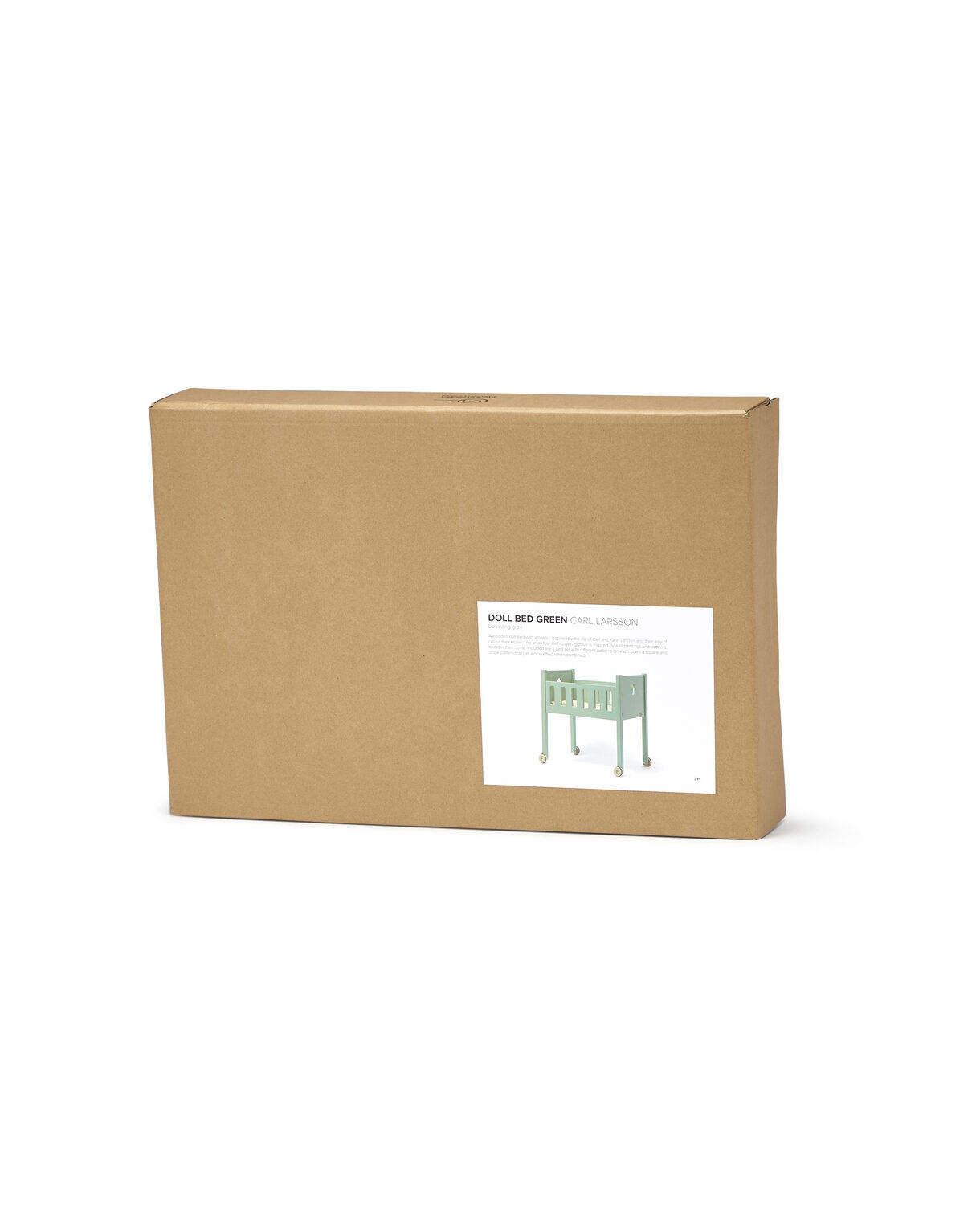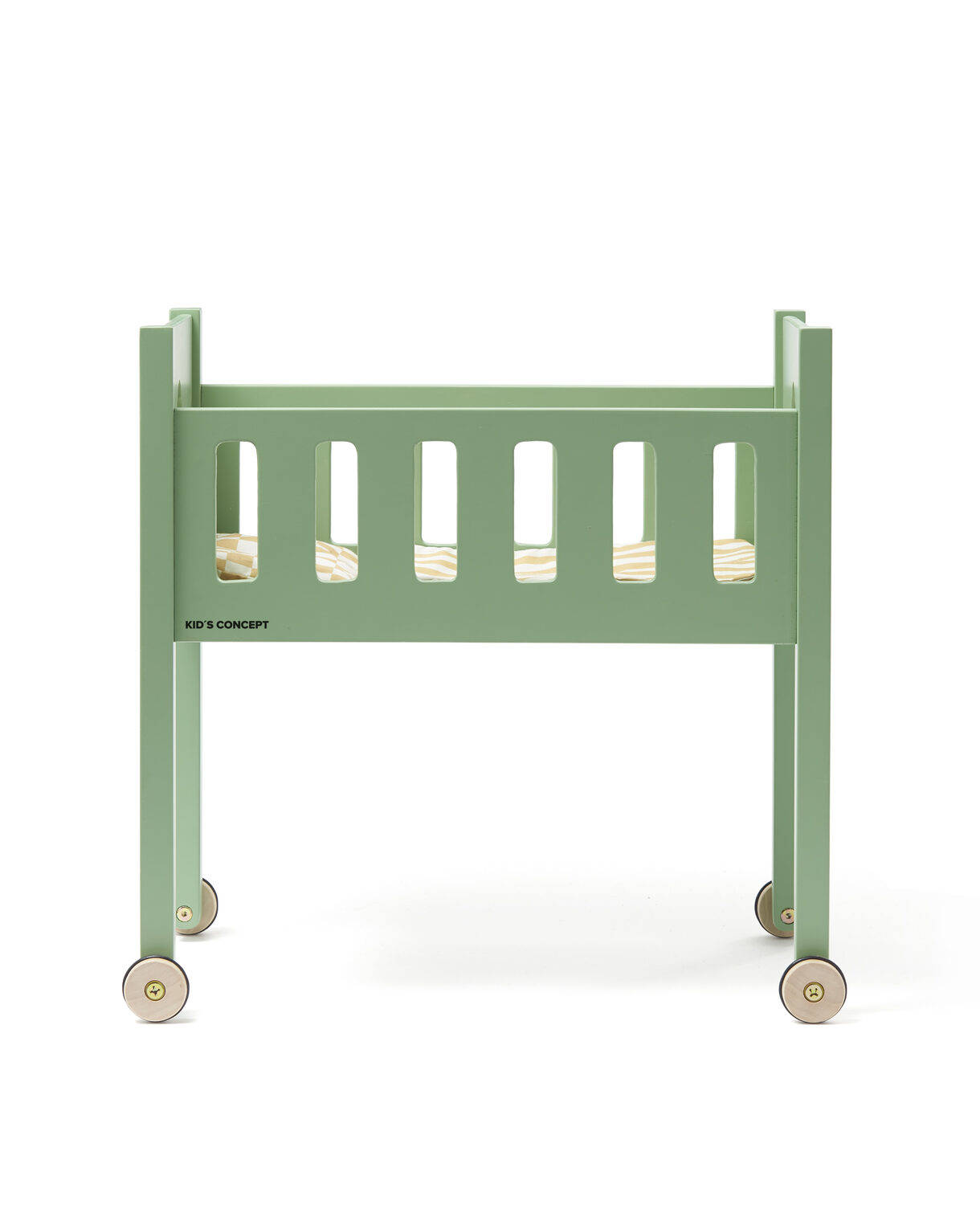 Ein hölzernes Puppenbett mit Rädern, an dessen kurzen Enden vierblättrige Kleeblätter ausgeschnitten sind.