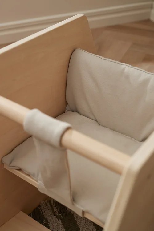 Textilsitz: Im 40-Grad-Schonwaschgang waschen. Kein Taumeln. Nach dem Waschen leicht dehnen. Holz: Mit einem feuchten Tuch reinigen. Mit einem sauberen Tuch trockenwischen. Überprüfen Sie regelmäßig, ob alle Schrauben fest sitzen und alle Teile intakt sind.