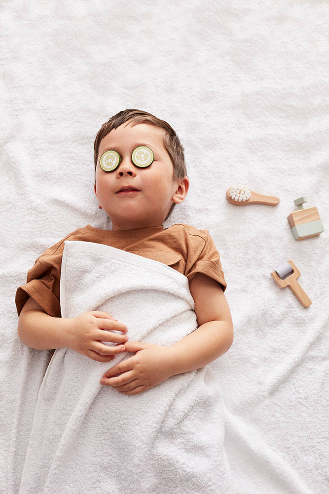 Masken, Massage und Entspannung! Die ganze Familie kann jetzt ein Home-Spa haben. Ja, manchmal können sowohl Erwachsene als auch Kinder ein wenig entspannen. Dieses luxuriöse Kinder-Spa-Set enthält alles, was Sie brauchen, um sich eine Weile zu entspannen und zur Ruhe zu kommen. Die Holzflasche mit Pumpe verfügt über eine kleine eingebaute Feder, wodurch sie einer echten Kosmetikflasche ähnelt. Das Set enthält außerdem eine Rührschüssel und einen kleinen Löffel, die für die Zubereitung eines Peelings oder einer Körpermaske erforderlich sind. Und was wäre ein Spa ohne Gurkenscheiben und eine schöne Gesichtsbehandlung? Gesichtsmasken bestehen aus dem gleichen Material wie eine klassische Stoffmaske. Sie können aus drei verschiedenen Arten von Masken wählen – basierend auf Blaubeeren, Honig und Erdbeeren. Wenn der Spaß vorbei ist, können Sie alle Ihre Accessoires ganz einfach in unserer Spa-Box mit Magnetverschluss verstauen.