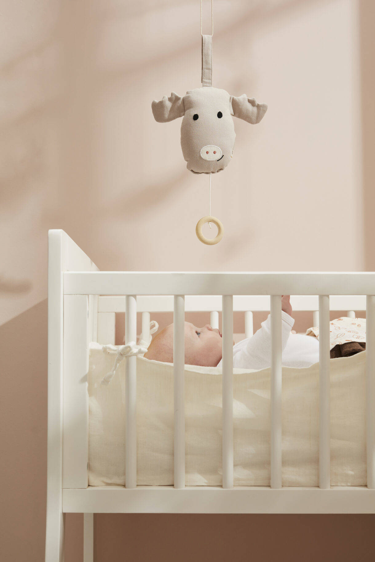 Ziehen Sie am Holzring und schon ist der Elch bereit, sich auf Ihr Baby einzustimmen. Es gibt dem Baby ein Gefühl der Sicherheit, wenn dieselbe Melodie gespielt wird. Klettverschlüsse zum Aufhängen erleichtern das Bewegen. Halten Sie Ihren Kleinen beim Windelwechseln bei Laune. Hängen Sie es in den Kinderwagen oder neben den Autositz. Mit einem feuchten Tuch reinigen oder den Stoff abstauben. Da die Spieluhr mechanische Teile enthält, kann sie nicht in der Waschmaschine gewaschen oder eingeweicht werden.