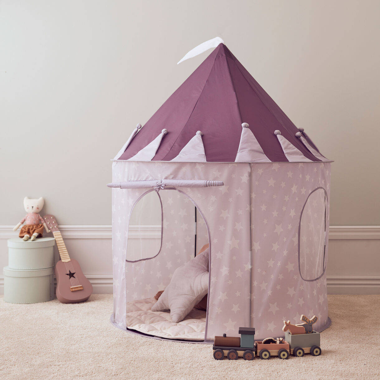Das Spielzelt ist ein fantasievoller Spielplatz für Kinder jeden Alters. Mit seinem detaillierten Design mit Sternen und einer von der Decke hängenden Wimpelgirlande ist es ein perfekter Ort zum Spielen, Träumen und für die Fantasie.