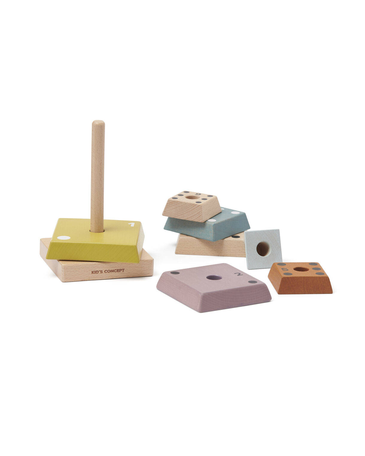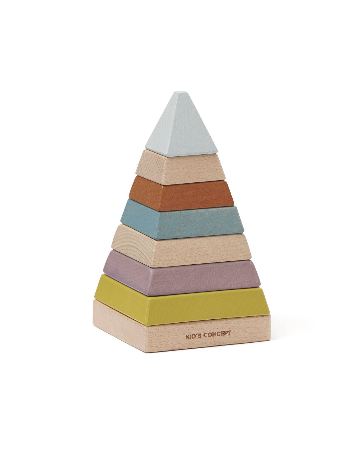 Pyramiden-Stapelturm mit stapelbaren, gebeizten Holzblöcken.