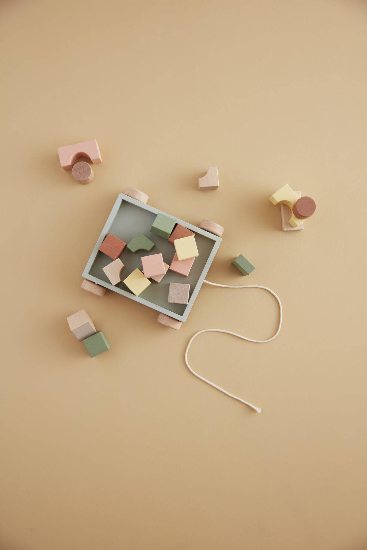 Dieser naturholzfarbene Zugwagen mit 20 gebeizten Holzklötzen ist zwei klassische Spielzeuge in einem.