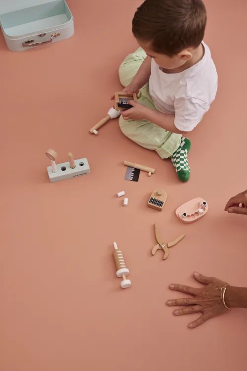 Tasche: Karton. Grifftasche: Edelstahl. Spritze, Bruch, Bohrer, Polierkopf, Spiegelgriff, Zähne: Birke. Spiegel: Acryl. Gummi: Sperrholz. Piler, Röntgengerät: Buche. Röntgenplatten: Papier. Werkzeugständer: MDF.