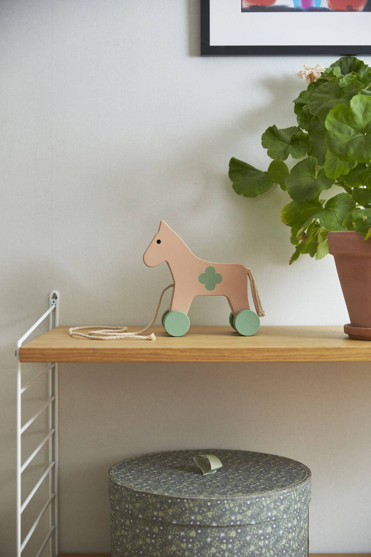 Ein hölzernes Spielzeugpferd aus der Carl Larsson-Kollektion mit einer 60 cm langen Zugschnur. Im Haus von Karin und Carl gibt es einen fantastischen Raum namens „Salon“ in dieser Farbkombination. Ein helles, mit einem frischen Grün kombiniertes Farbschema, das um 1890 in England häufig verwendet wurde. So ließ sich Karin von ihrer Schwester inspirieren, die zu dieser Zeit in London lebte. Das Zimmer verfügt über schlichte Blockstreifen und weiße Möbel kombiniert mit antiken und barocken Möbeln – ein Mix aus allem auf schöne Art und Weise! Das Muster auf der Seite des Pferdes ist von den gemalten Wandgemälden in Form eines vierblättrigen Kleeblatts im Haus inspiriert. FSC-zertifiziert.