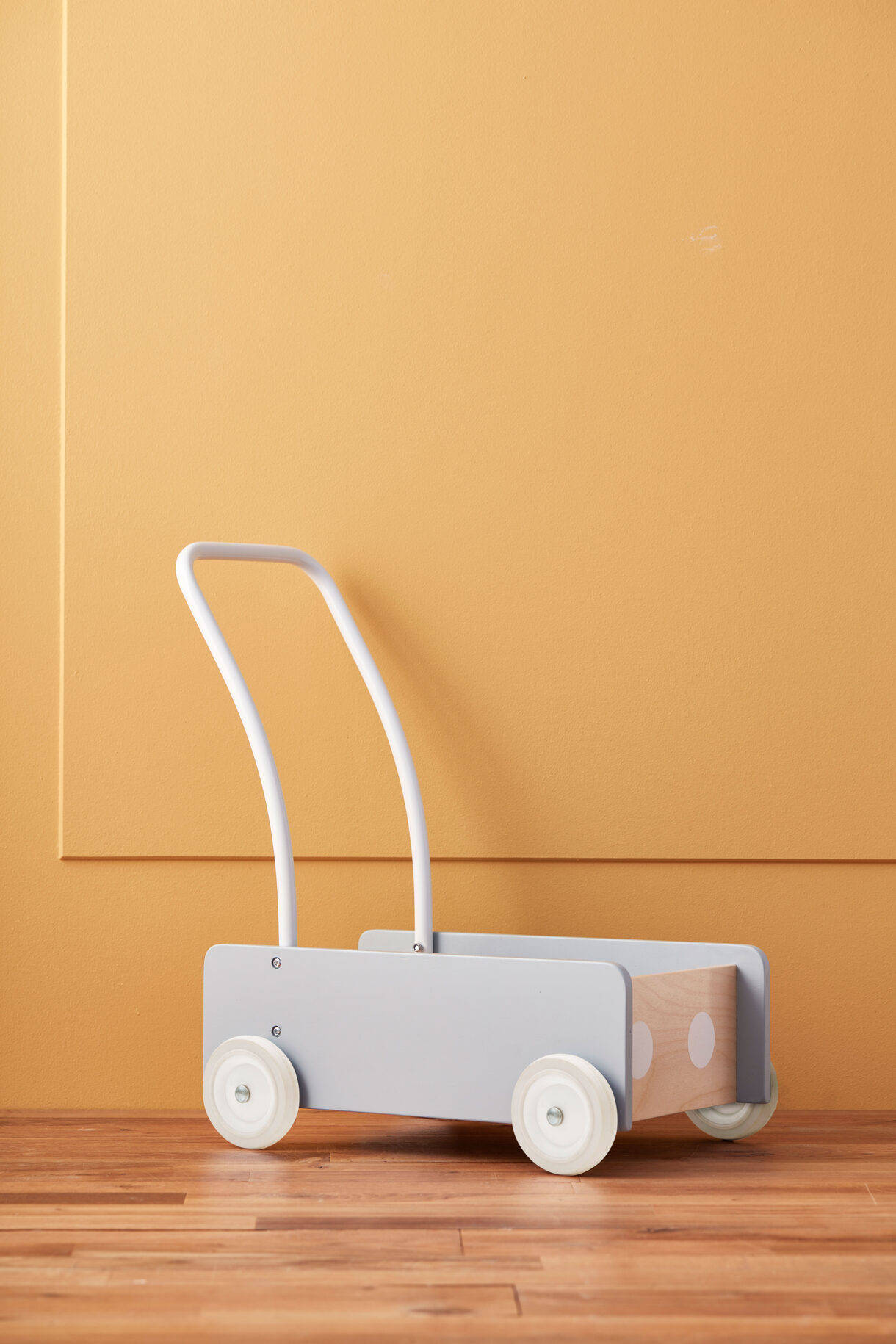 Lauflernhilfen sind die perfekte Unterstützung für Babys, die gerade mit dem Laufenlernen begonnen haben, dienen aber auch als eigenständiges Spielzeug und zum Platzieren anderer Spielzeuge auch für etwas ältere Kinder. Der Griff des Gehwagens kann auf zwei Arten positioniert werden: Die aufrechte Position wird verwendet, wenn der Gehwagen stabiler sein soll und das Kind gerade erst mit dem Laufen begonnen hat und mehr Unterstützung benötigt. Wenn das Kind wächst und ruhig gehen kann, können Sie den Griff in einen größeren Winkel stellen und ihn wie einen normalen Kinderwagen verwenden. Die Bremse kann mit den kleinen Schrauben an den Hinterrädern eingestellt werden. Verwenden Sie einen kleinen, normalen Schraubenzieher. Beim Einschrauben drehen sich die Räder langsamer. Dies ist für kleinere Kinder geeignet, damit diese stehen und das Fahrzeug langsam vorwärts schieben können.