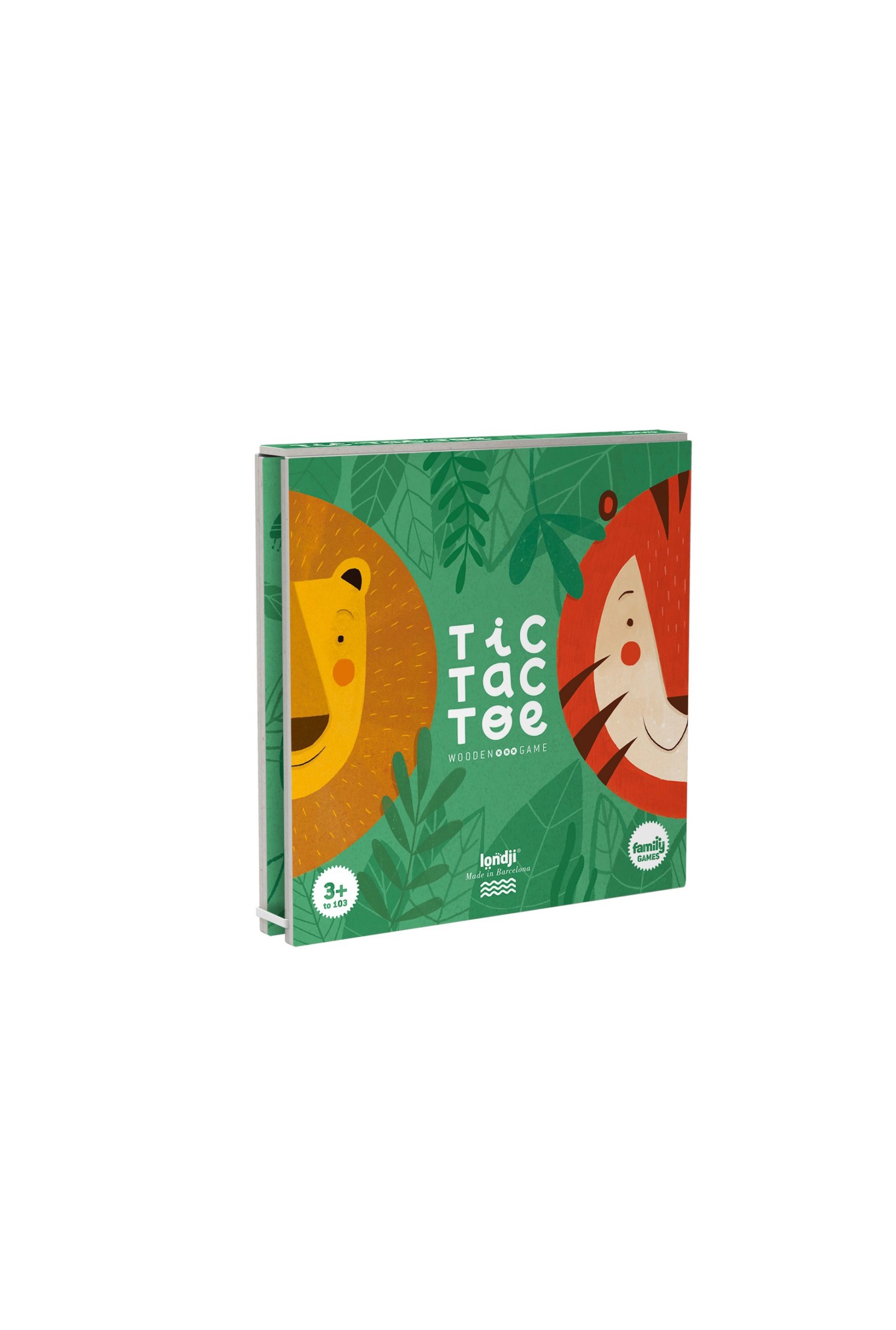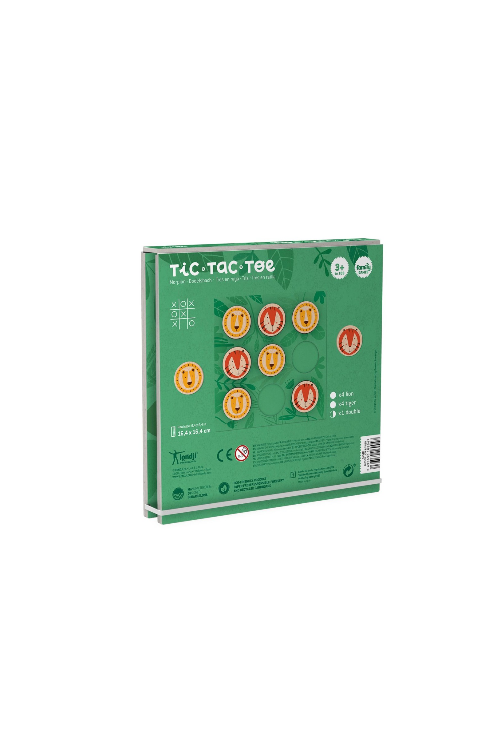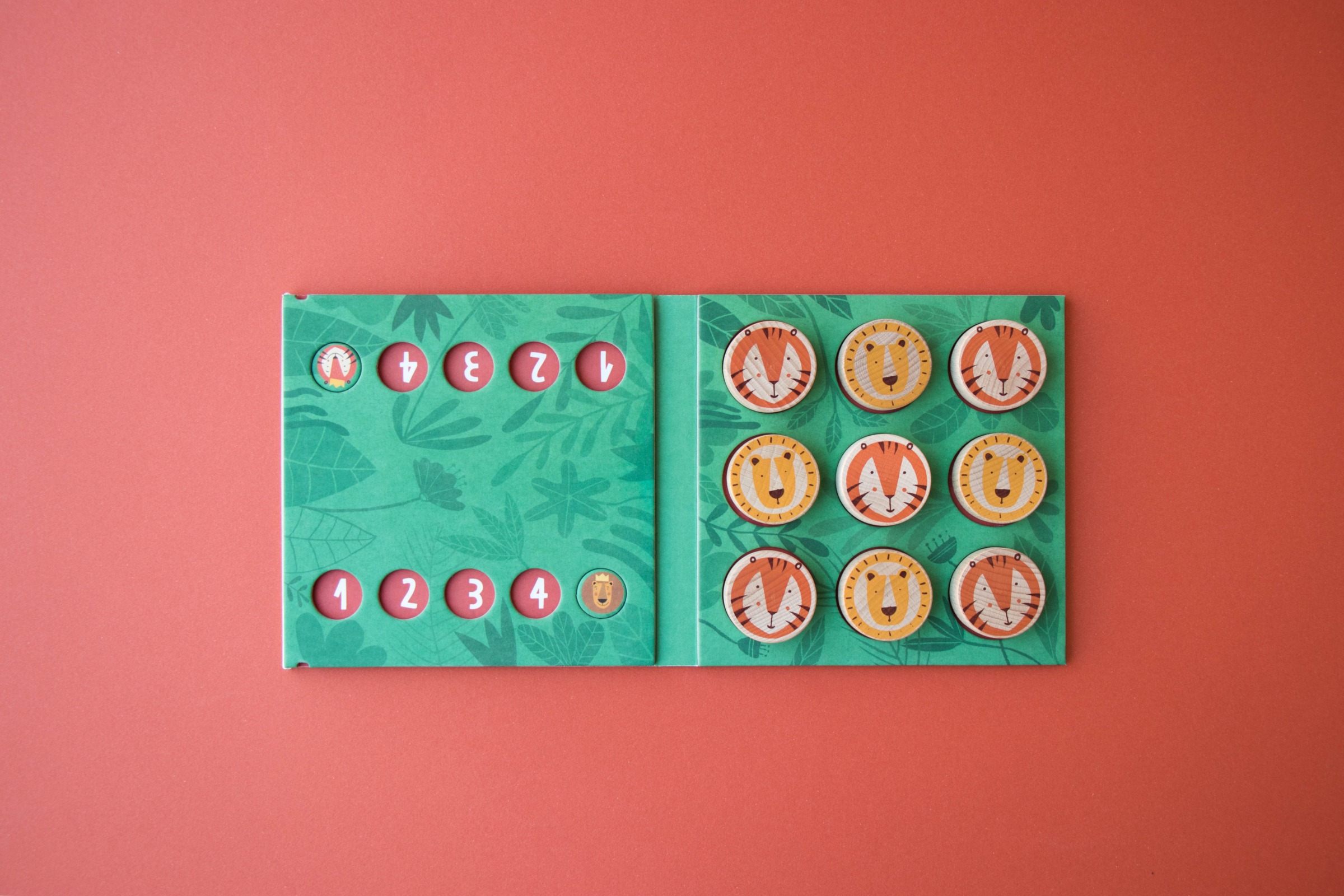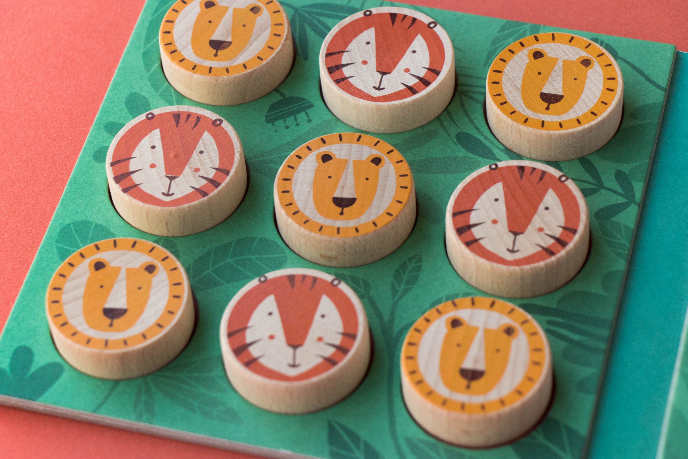 Ein traditionelles Drei-in-einer-Reihe-Spiel mit Tigern und Löwen. Enthält neun Buchenholzstücke aus nachhaltigen Wäldern und ein Spielbrett aus recyceltem Material.