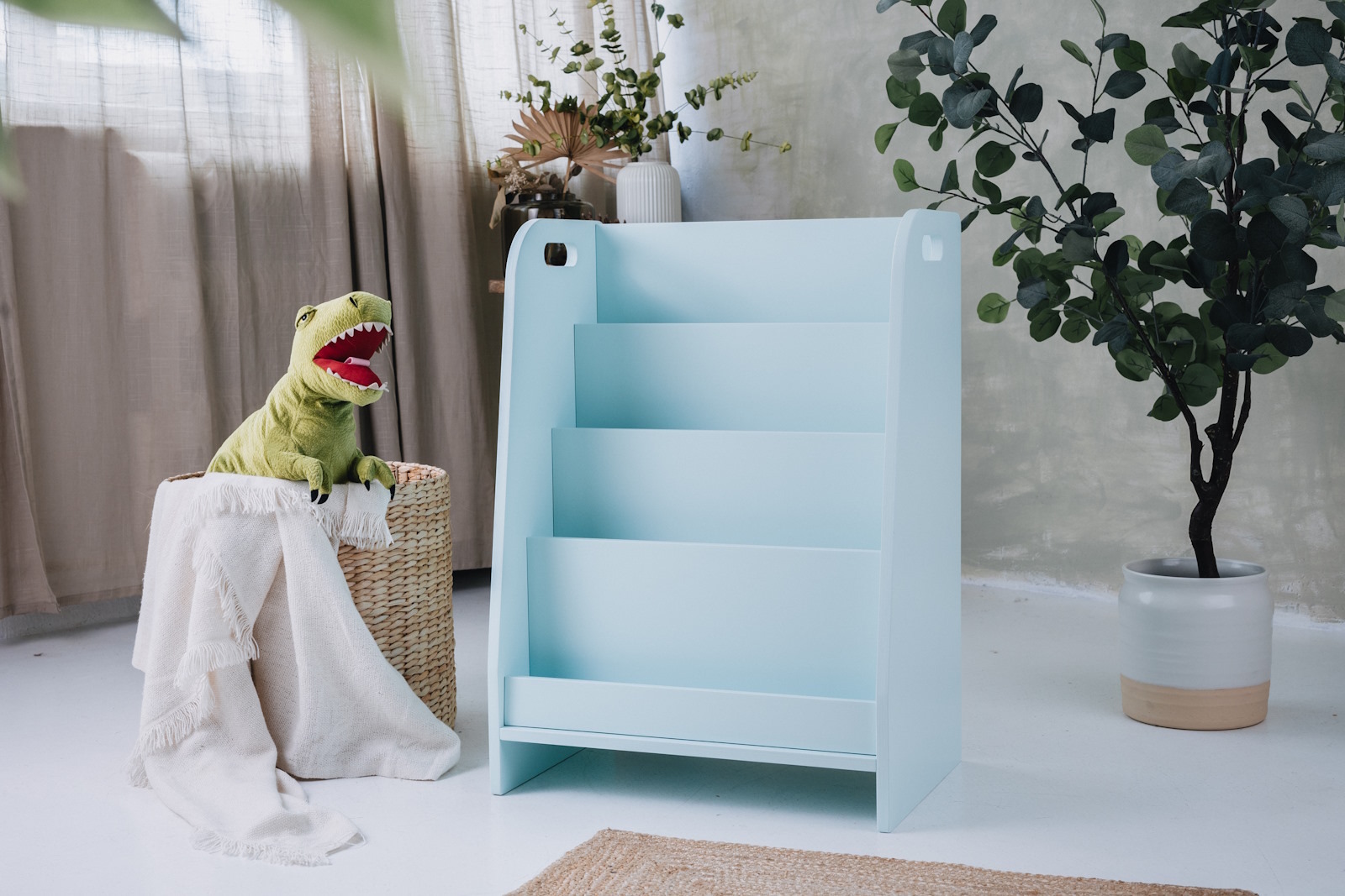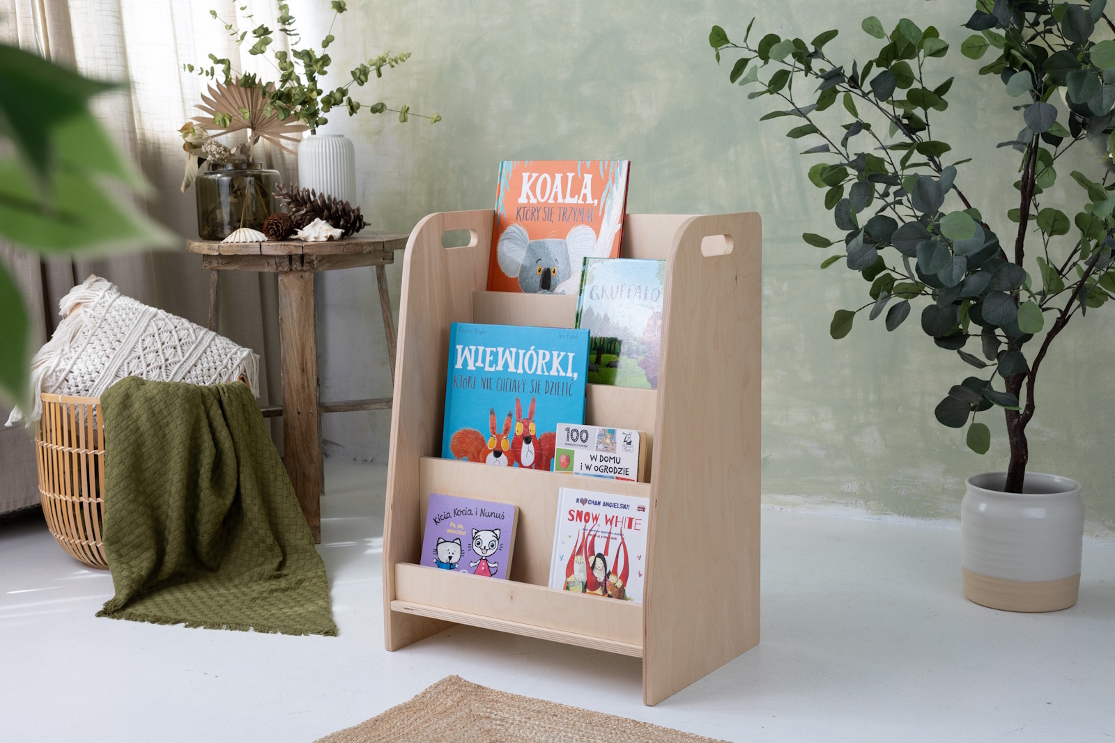 Ein Kinderbücherregal in Form eines offenen und transparenten Bücherregals ist die perfekte Wahl für Liebhaber von Harmonie und Einfachheit in der Inneneinrichtung. Gemäß den Grundsätzen der Montessori-Methode ist dieses Möbelstück darauf ausgelegt, die Entwicklung eines Kindes zu unterstützen. Schon die Art und Weise, wie Bücher mit ihren Covern nach vorne ausgerichtet sind, ermöglicht jungen Lesern eine sorgfältige Auswahl ihrer Lektüre. Der volle Zugang zu den Regalen und Taschen auf Bodenhöhe erleichtert nicht nur das Erreichen des ausgewählten Buches, sondern ermutigt auch dazu, es wieder an seinen Platz zu stellen, was Selbstdisziplin und Sorge um den eigenen Raum lehrt.