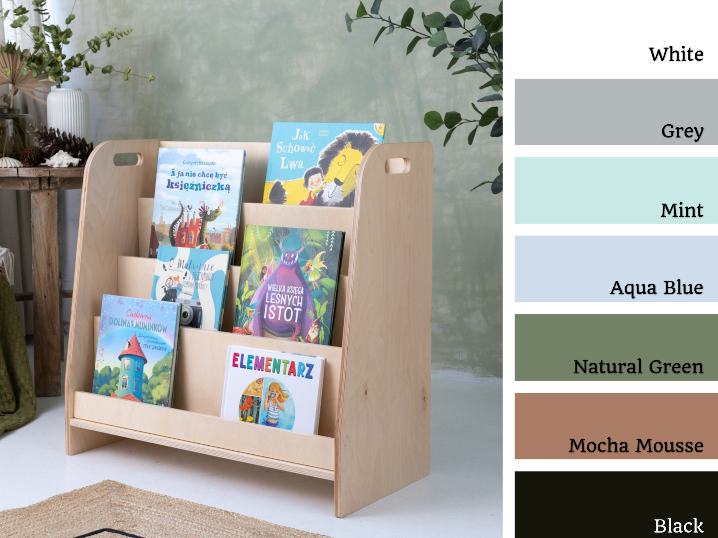 Das Kinderbücherregal ist handgefertigt aus 15 mm dickem Sperrholz aus Hartholz. Es wurde mit umweltfreundlichen und kindersicheren Beschichtungen und Farben bemalt, die die Anforderungen der europäischen Norm PN EN 71.3 erfüllen.