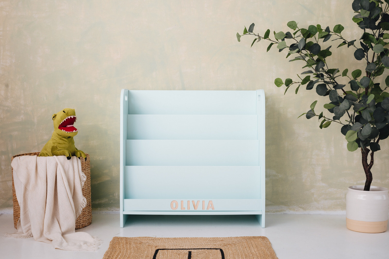 Das Kinderbücherregal ist handgefertigt aus 15 mm dickem Sperrholz aus Hartholz. Es wurde mit umweltfreundlichen und kindersicheren Beschichtungen und Farben bemalt, die die Anforderungen der europäischen Norm PN EN 71.3 erfüllen.