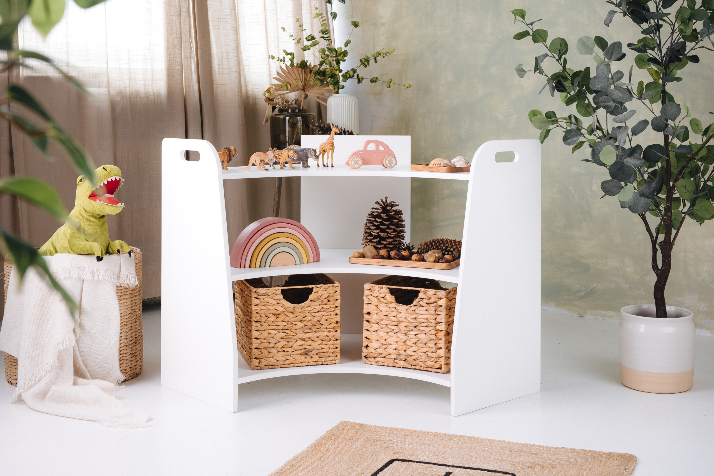 Das Spielzeugregal verfügt über drei Regale, auf die das Kind uneingeschränkten Zugriff hat. Das Möbelstück steht direkt auf dem Boden und misst nur 70 cm in der Höhe.