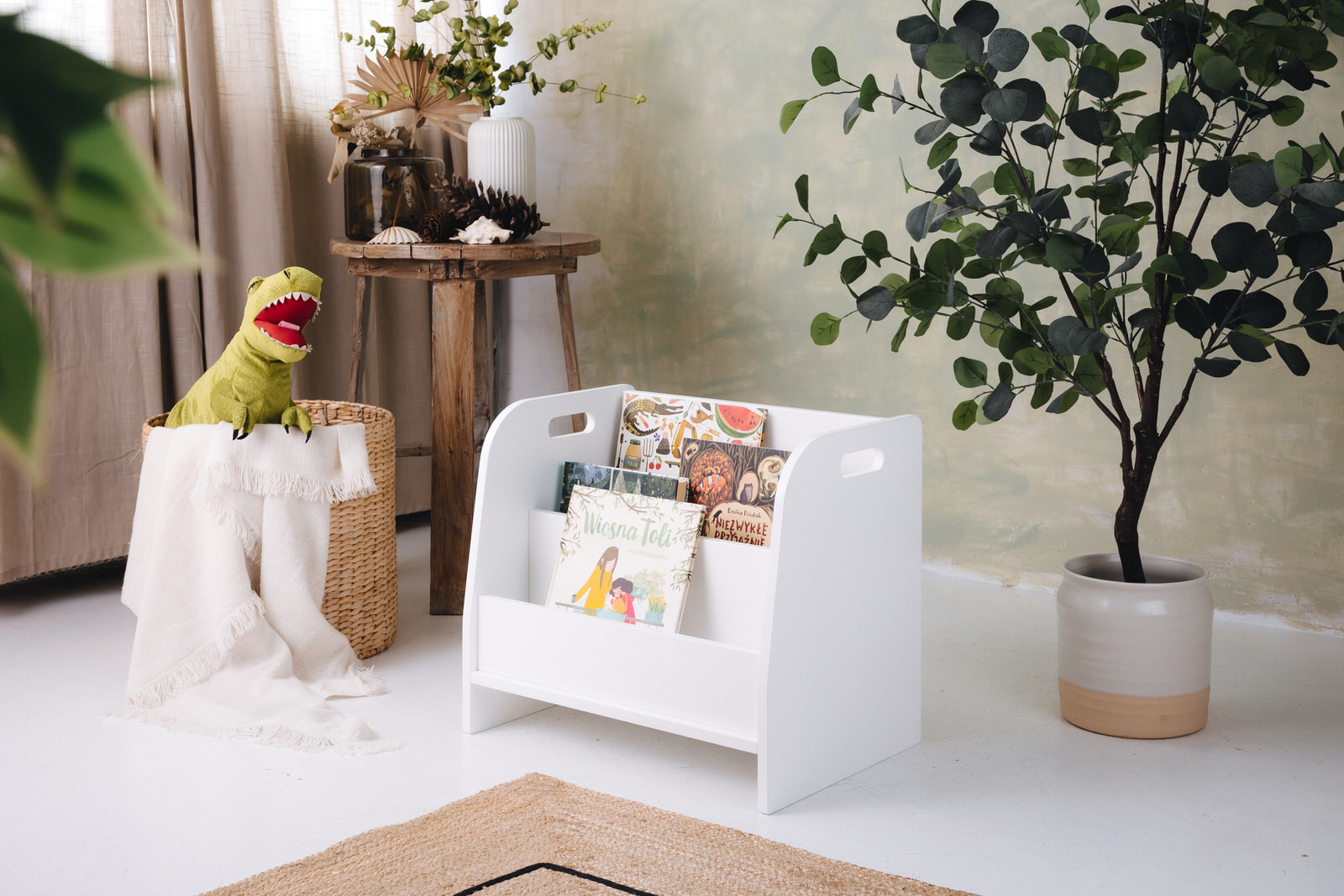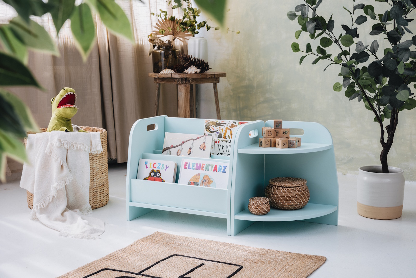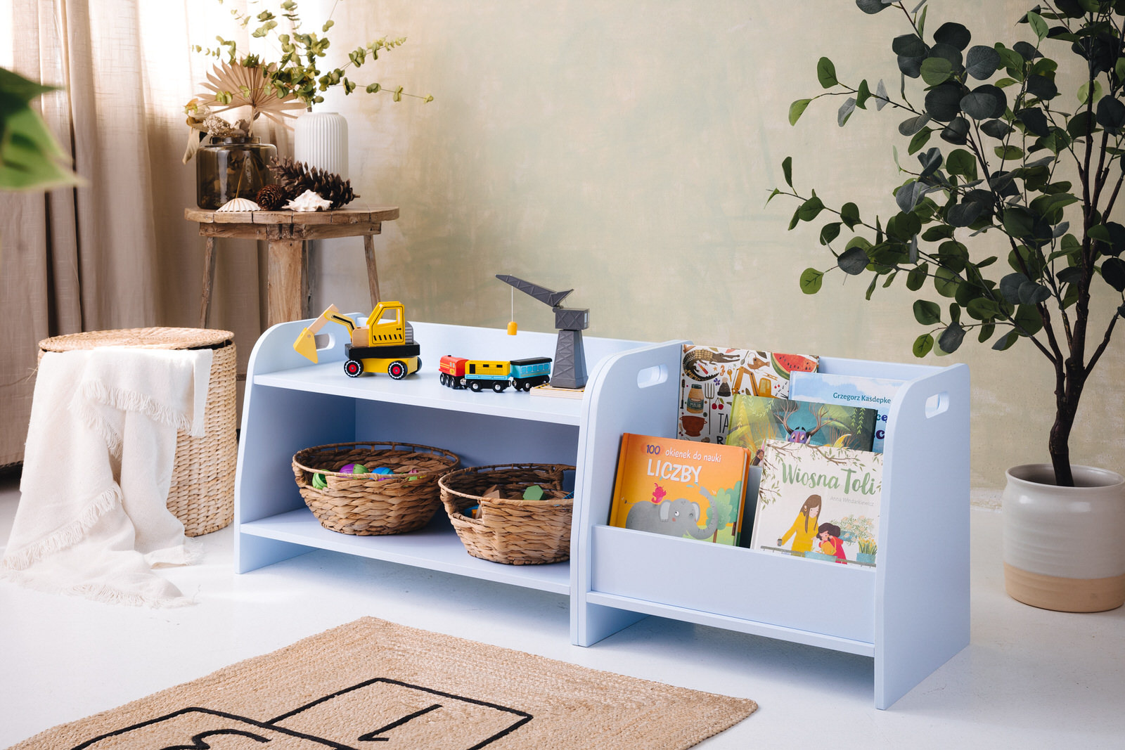 Ein Kinderbücherregal in Form eines offenen und transparenten Bücherregals ist die perfekte Wahl für Liebhaber von Harmonie und Einfachheit in der Inneneinrichtung. Gemäß den Grundsätzen der Montessori-Methode ist dieses Möbelstück darauf ausgelegt, die Entwicklung eines Kindes zu unterstützen. Schon die Art und Weise, wie Bücher mit ihren Covern nach vorne ausgerichtet sind, ermöglicht jungen Lesern eine sorgfältige Auswahl ihrer Lektüre. Der volle Zugang zu den Regalen und Taschen auf Bodenhöhe erleichtert nicht nur das Erreichen des ausgewählten Buches, sondern ermutigt auch dazu, es wieder an seinen Platz zu stellen, was Selbstdisziplin und Sorge um den eigenen Raum lehrt.