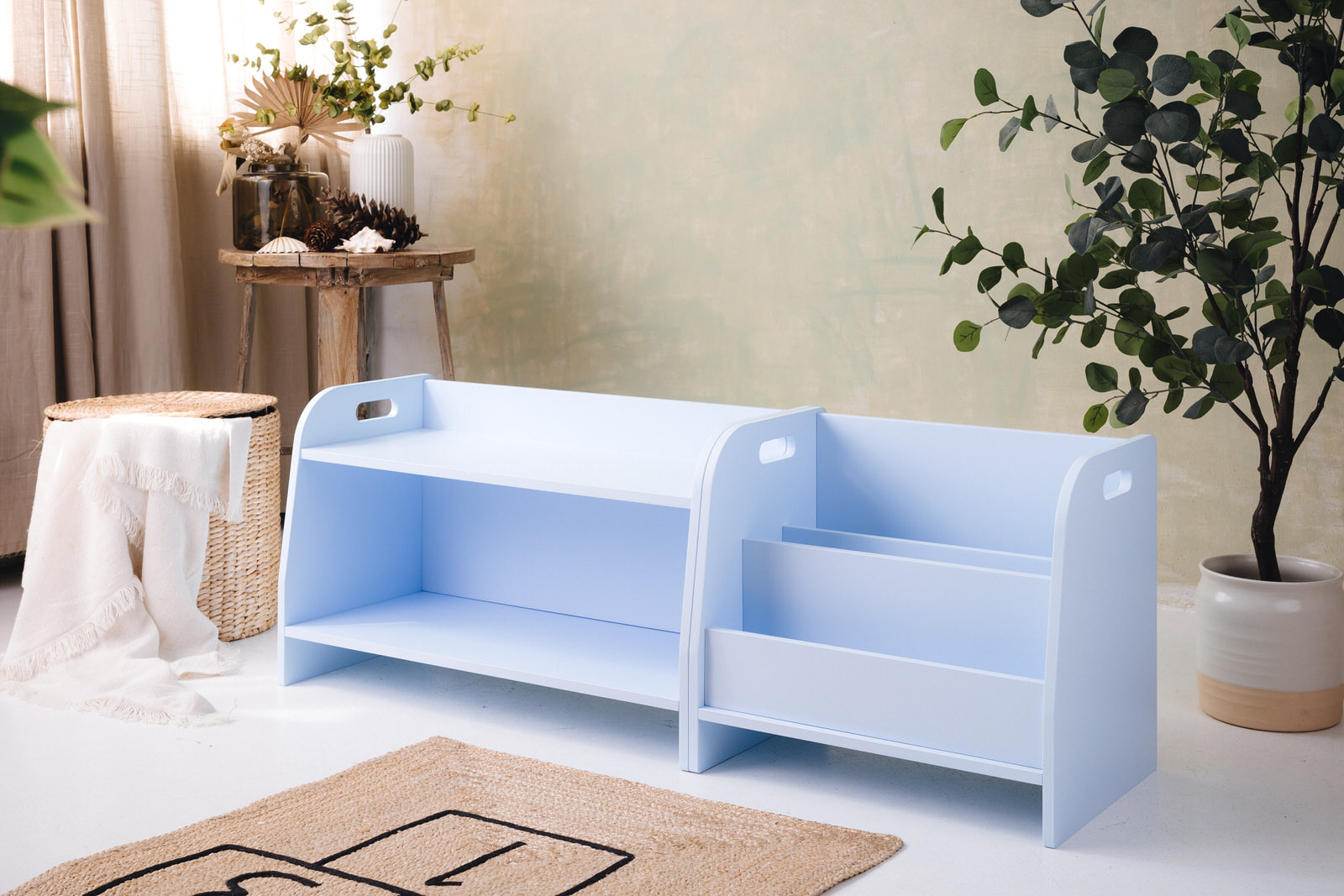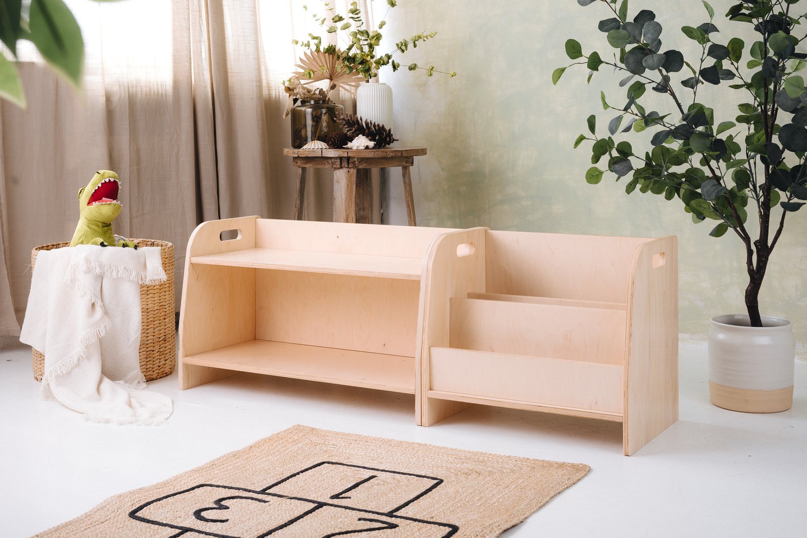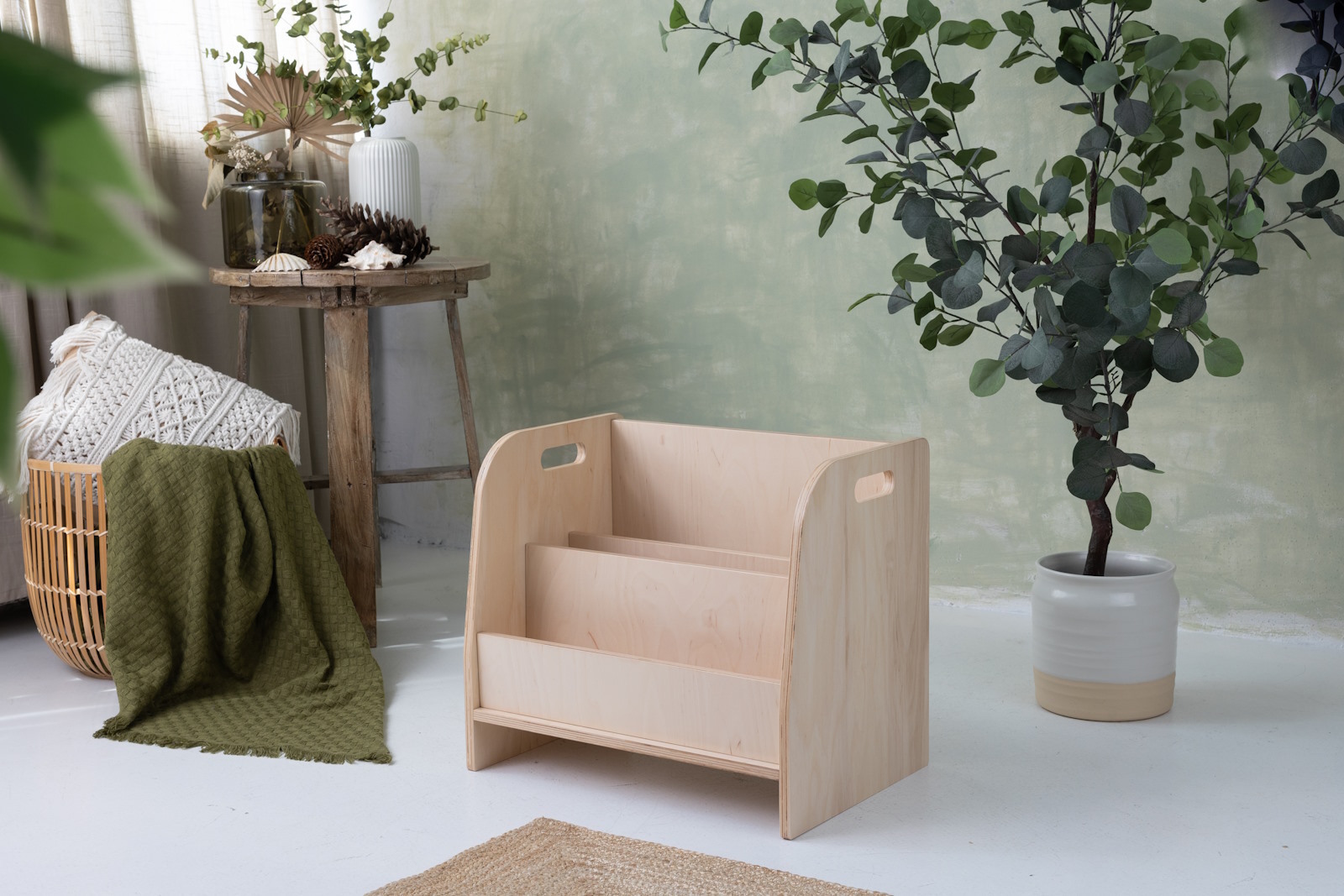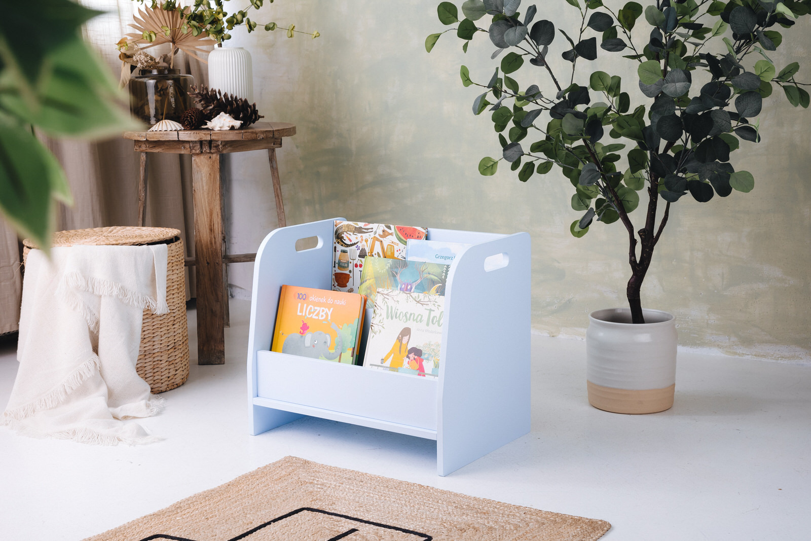 Ein Kinderbücherregal in Form eines offenen und transparenten Bücherregals ist die perfekte Wahl für Liebhaber von Harmonie und Einfachheit in der Inneneinrichtung. Gemäß den Grundsätzen der Montessori-Methode ist dieses Möbelstück darauf ausgelegt, die Entwicklung eines Kindes zu unterstützen. Schon die Art und Weise, wie Bücher mit ihren Covern nach vorne ausgerichtet sind, ermöglicht jungen Lesern eine sorgfältige Auswahl ihrer Lektüre. Der volle Zugang zu den Regalen und Taschen auf Bodenhöhe erleichtert nicht nur das Erreichen des ausgewählten Buches, sondern ermutigt auch dazu, es wieder an seinen Platz zu stellen, was Selbstdisziplin und Sorge um den eigenen Raum lehrt.