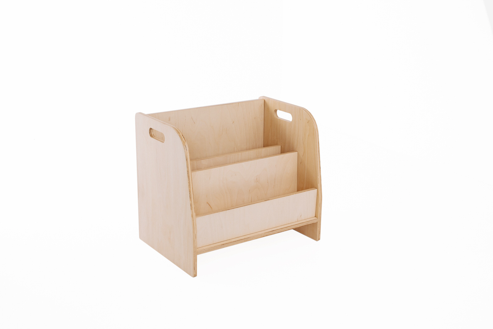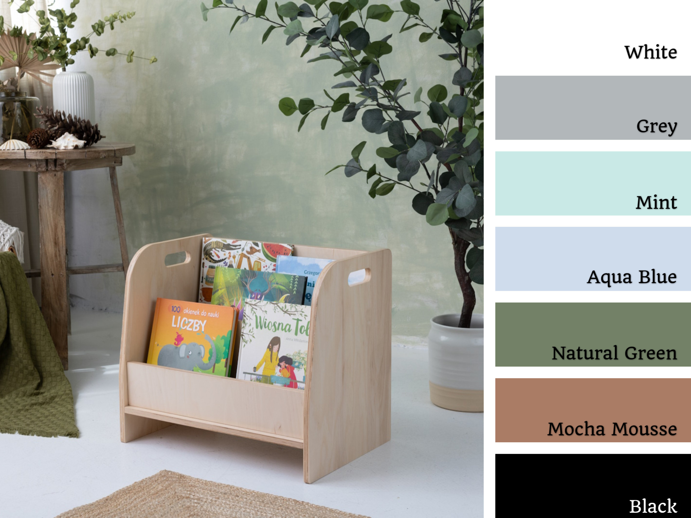 Das Kinderbücherregal ist handgefertigt aus 15 mm dickem Sperrholz aus Hartholz. Es wurde mit umweltfreundlichen und kindersicheren Beschichtungen und Farben bemalt, die die Anforderungen der europäischen Norm PN EN 71.3 erfüllen.