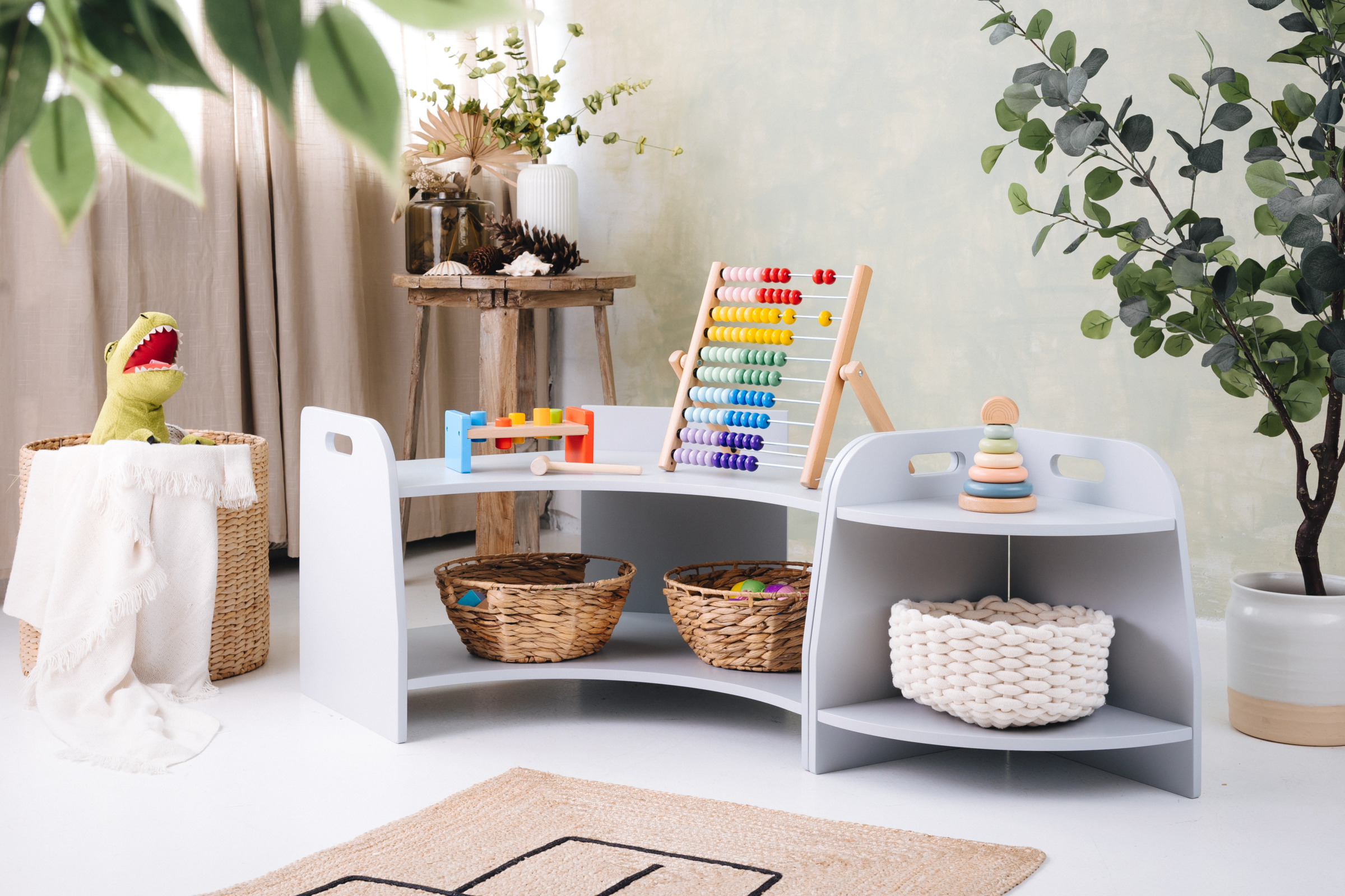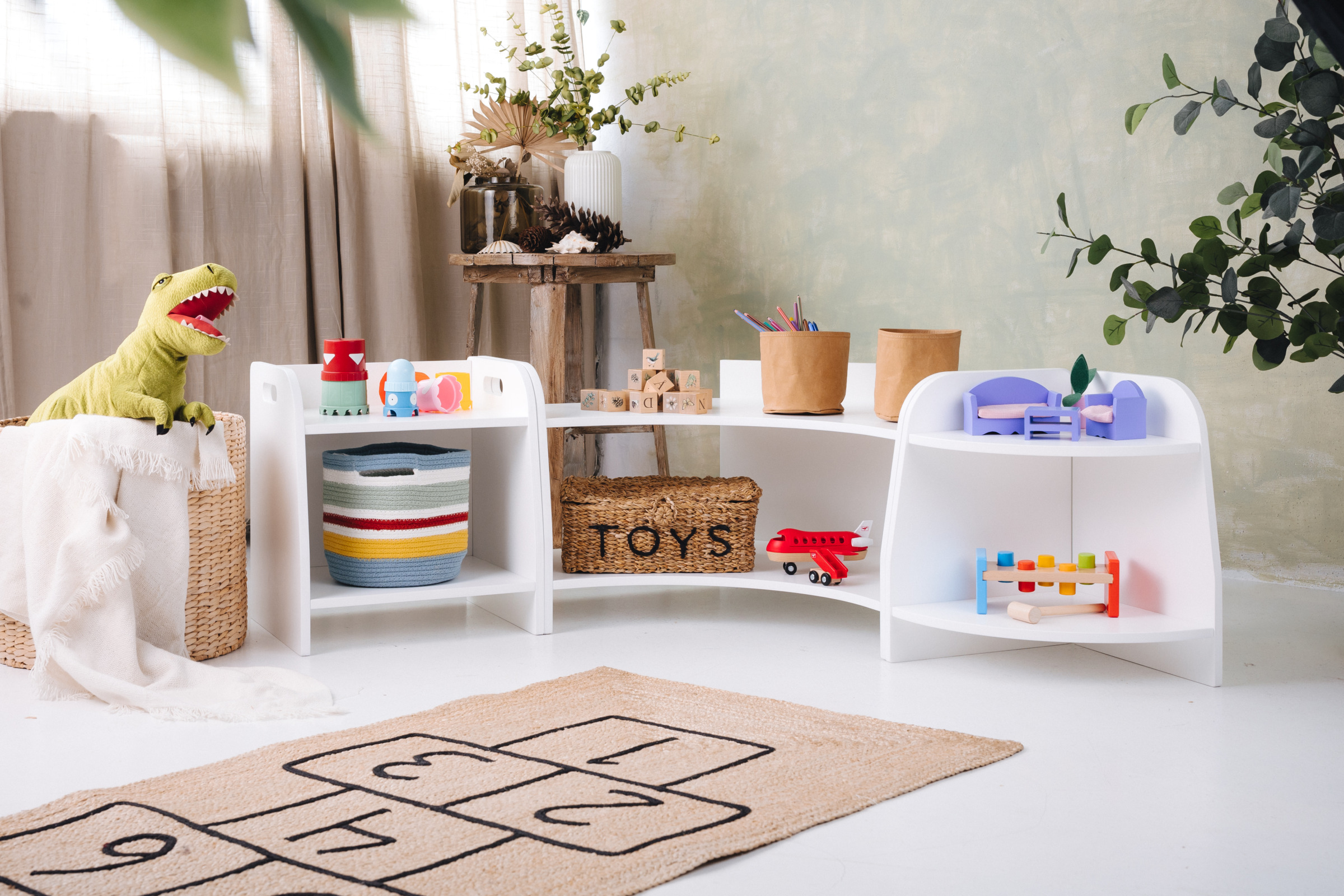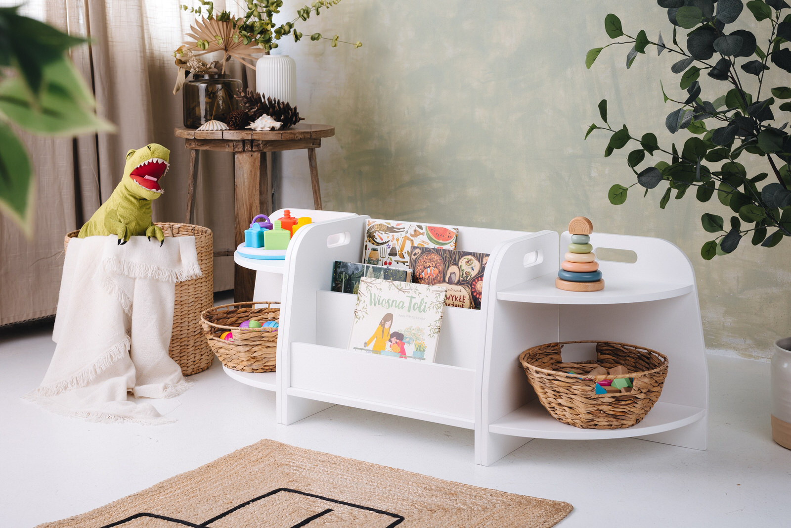 Das Spielzeugregal hat zwei Regale, auf die das Kind uneingeschränkten Zugriff hat. Das Möbel steht direkt auf dem Boden und misst nur 44 cm in der Höhe