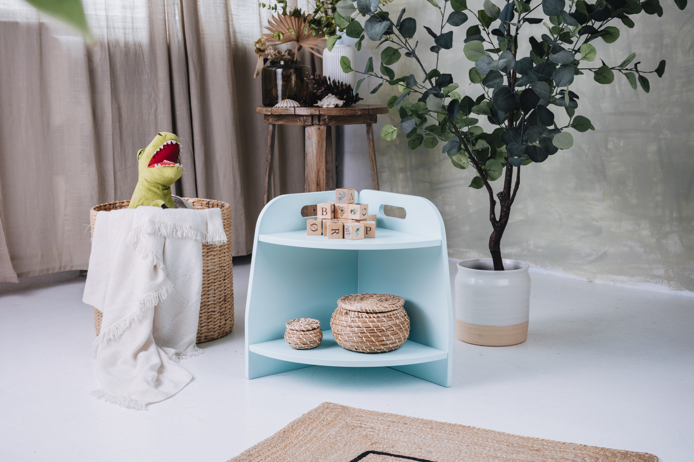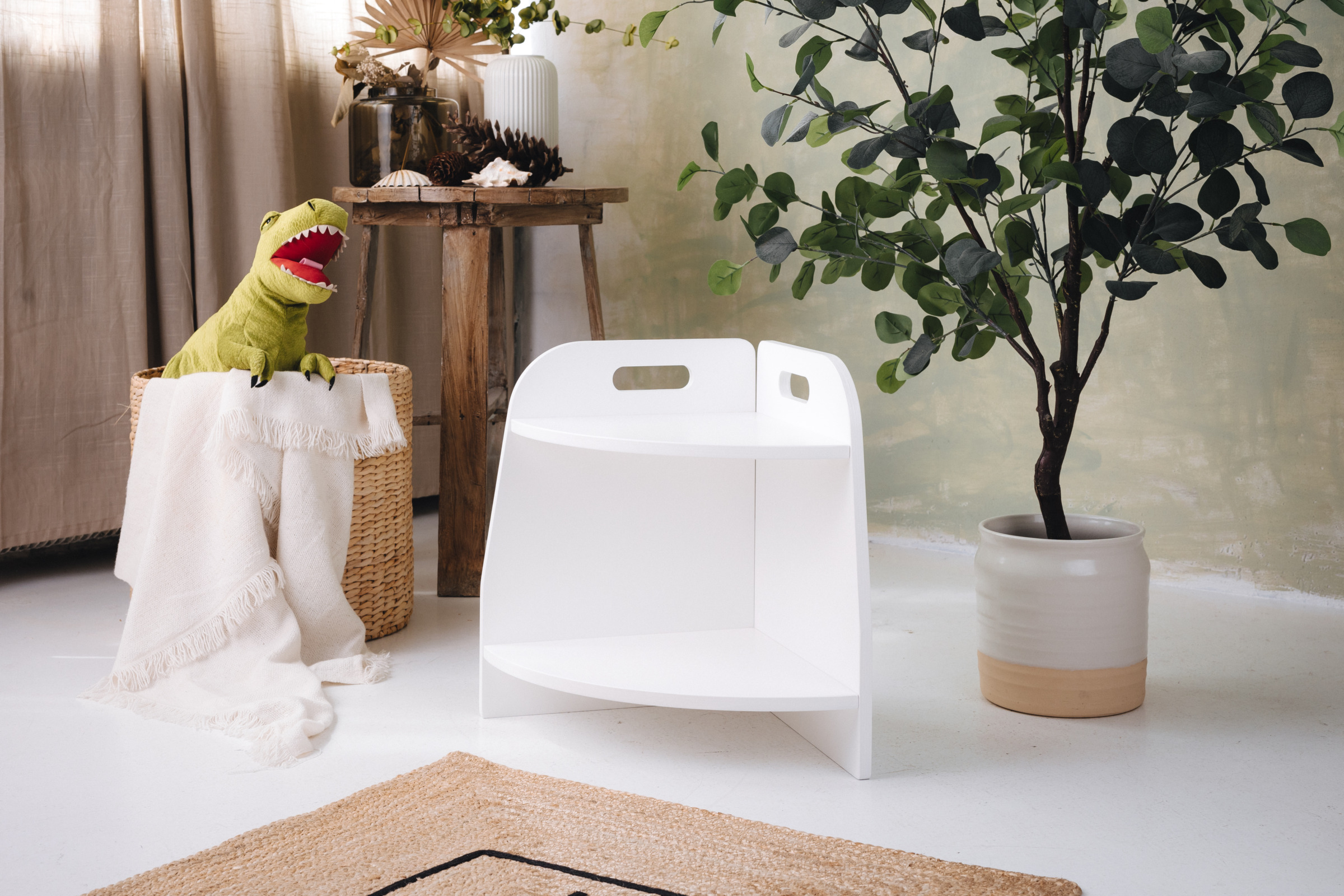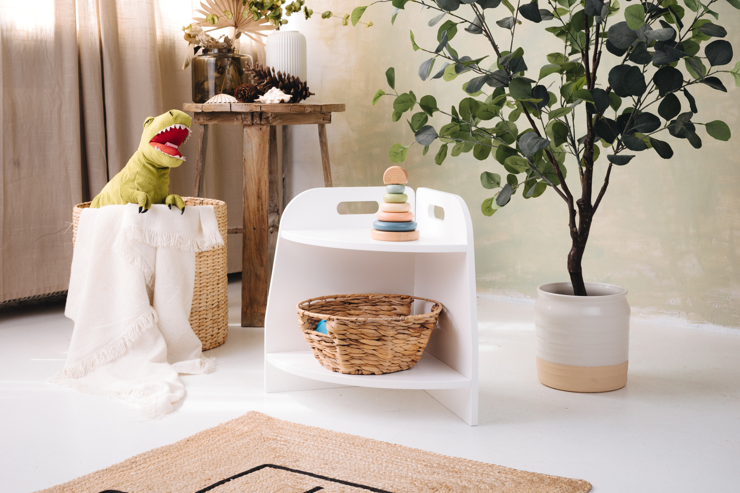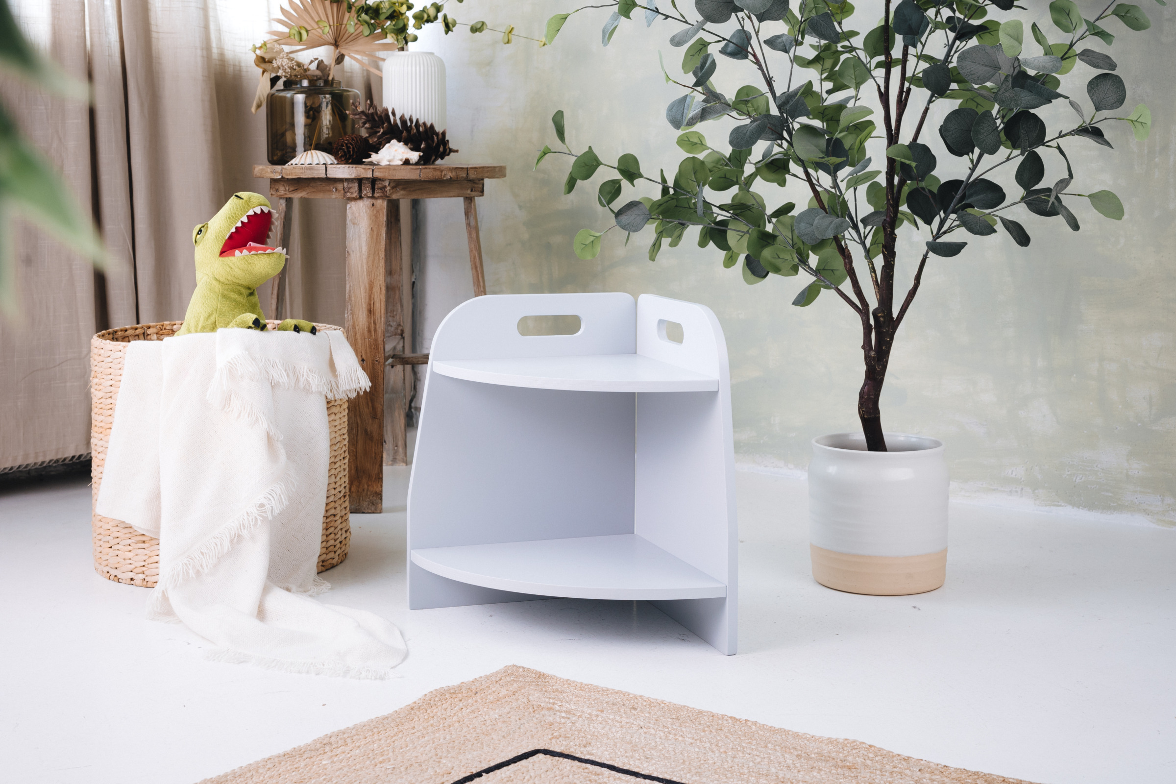 Das Spielzeugregal hat zwei Regale, auf die das Kind uneingeschränkten Zugriff hat. Das Möbel steht direkt auf dem Boden und misst nur 44 cm in der Höhe