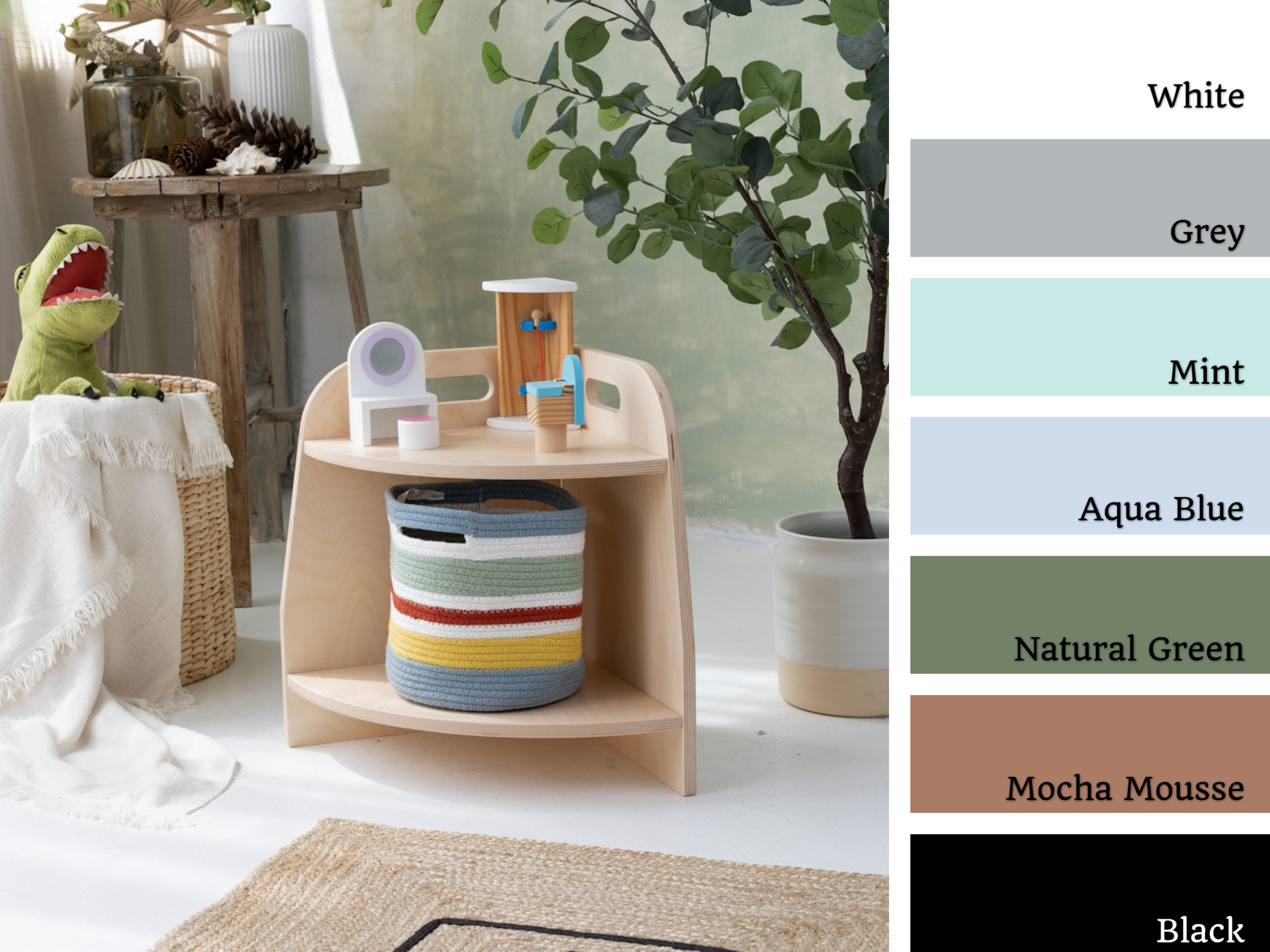 Das Spielzeugregal wurde in Handarbeit aus 15 mm dickem Sperrholz aus Hartholz gefertigt. Es wurde vollständig mit umweltfreundlichen und für Kinder sicheren Farben bemalt und erfüllt die Anforderungen der europäischen Norm PN EN 71.3, unter anderem.