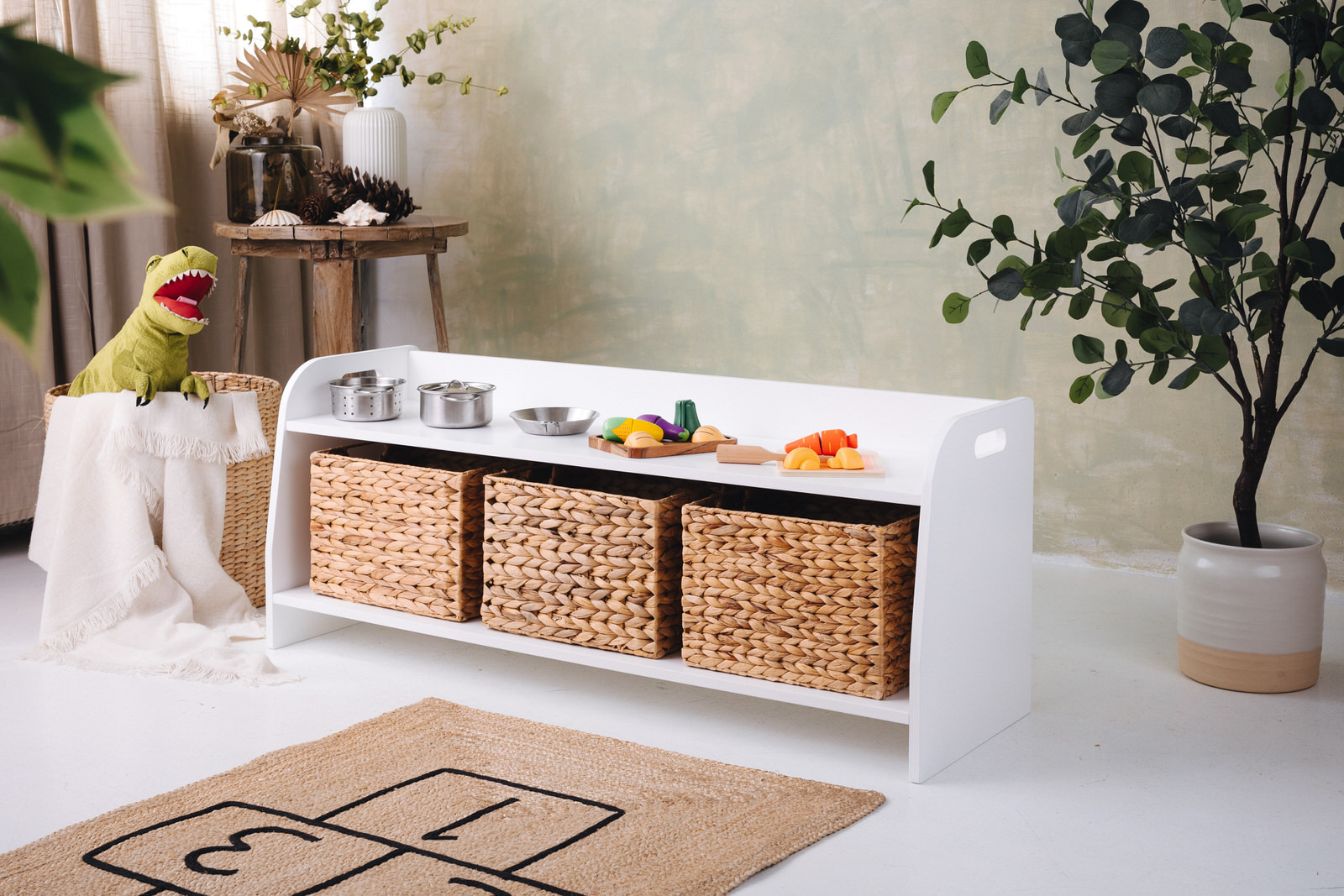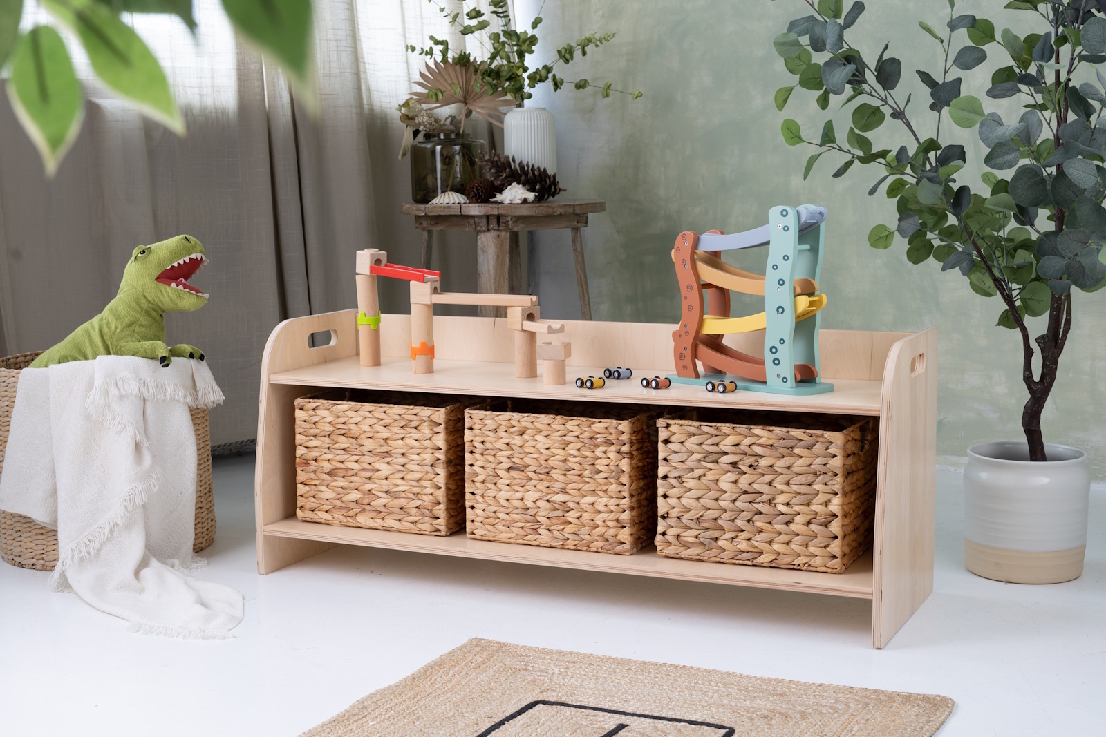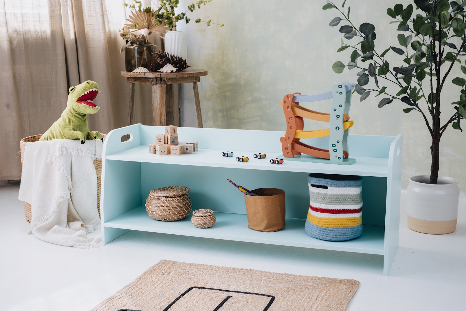 Das Spielzeugregal hat zwei Regale, auf die das Kind uneingeschränkten Zugriff hat. Das Möbel steht direkt auf dem Boden und misst nur 44 cm in der Höhe.