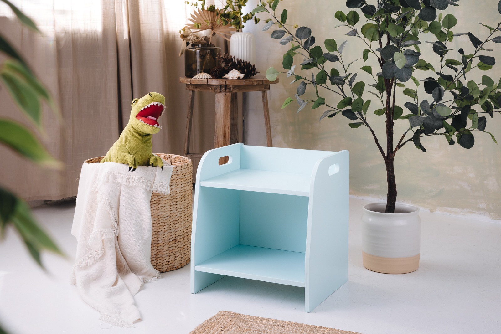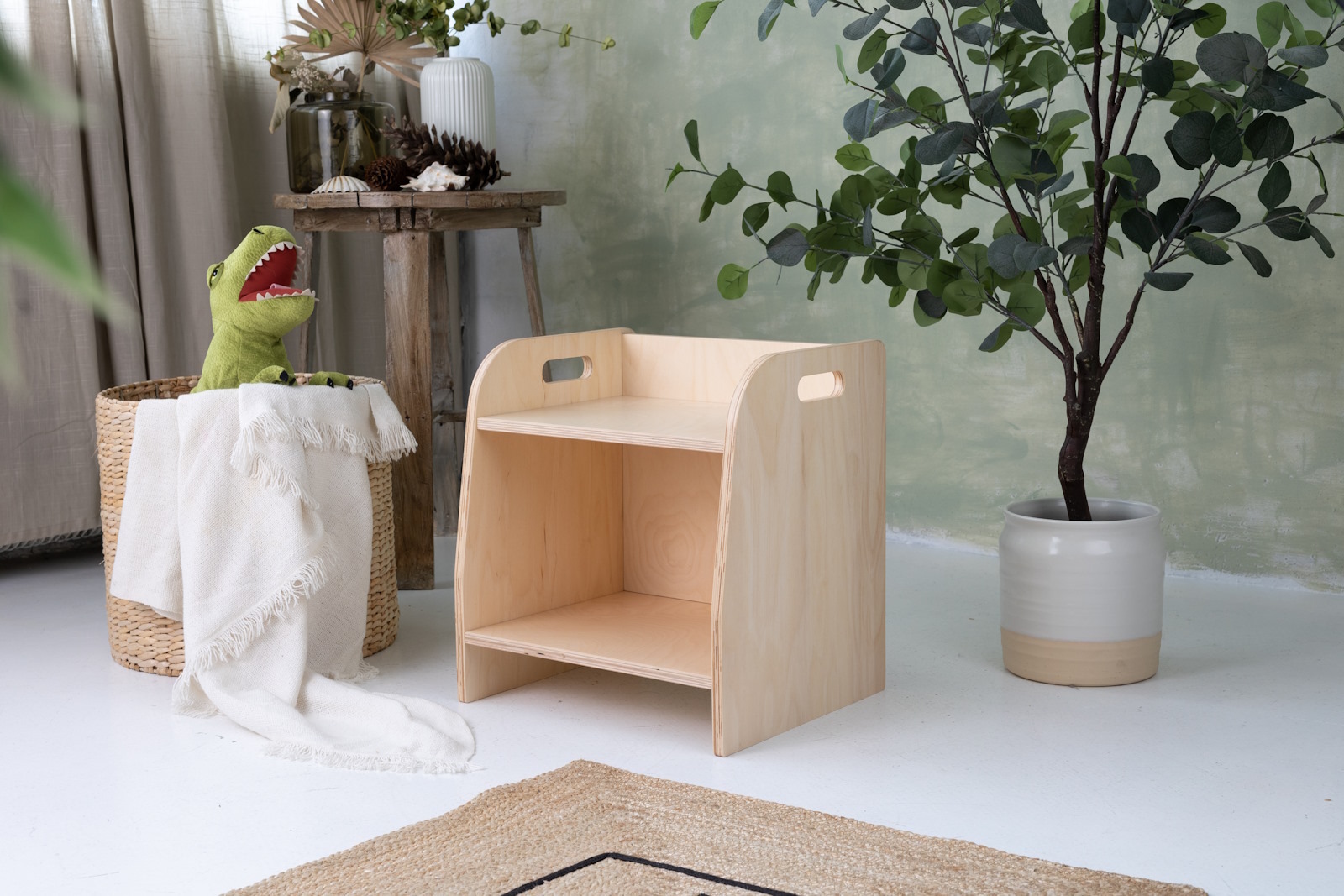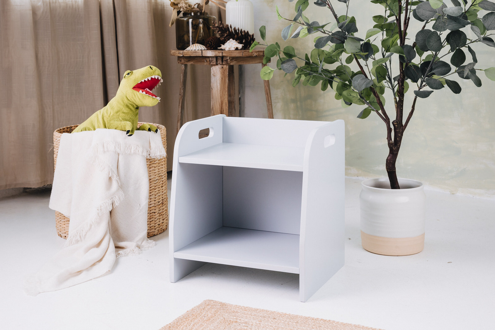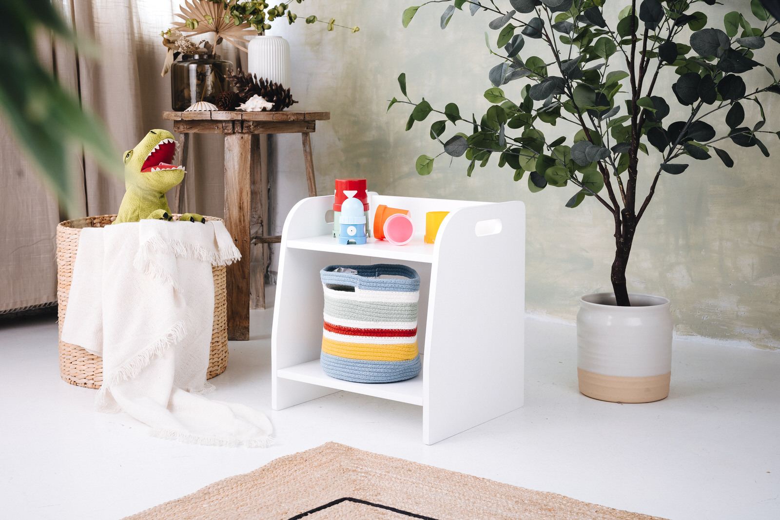 Das Spielzeugregal hat zwei Regale, auf die das Kind uneingeschränkten Zugriff hat. Das Möbel steht direkt auf dem Boden und misst nur 44 cm in der Höhe.