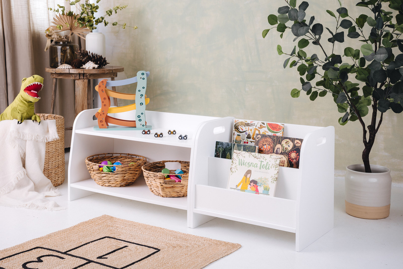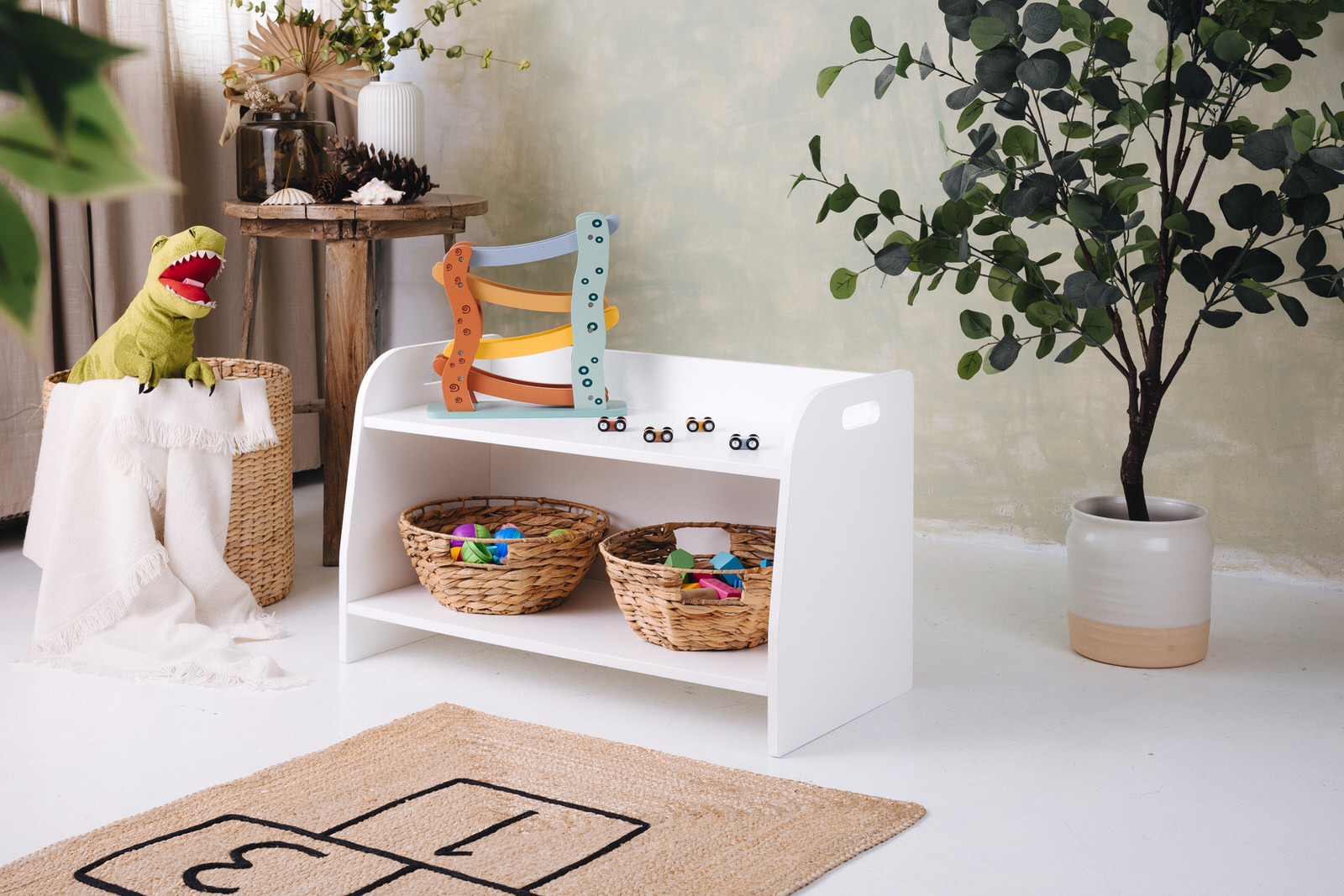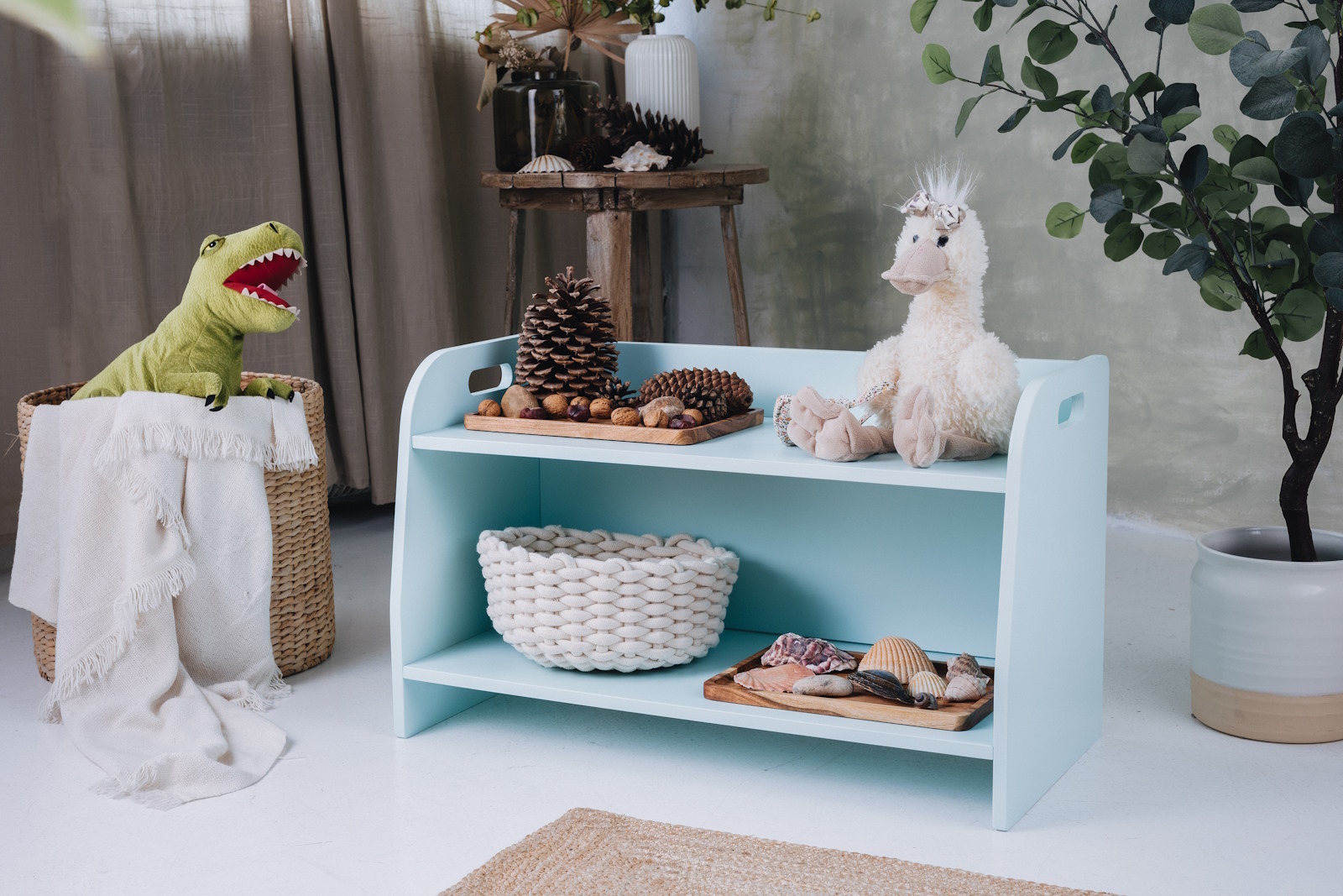 Das Spielzeugregal hat zwei Regale, auf die das Kind uneingeschränkten Zugriff hat. Das Möbel steht direkt auf dem Boden und misst nur 44 cm in der Höhe.