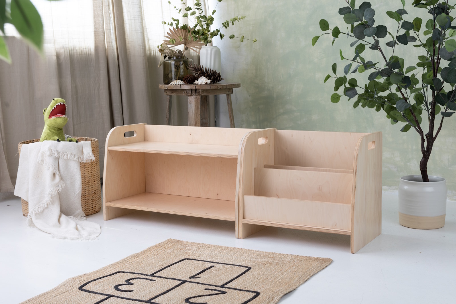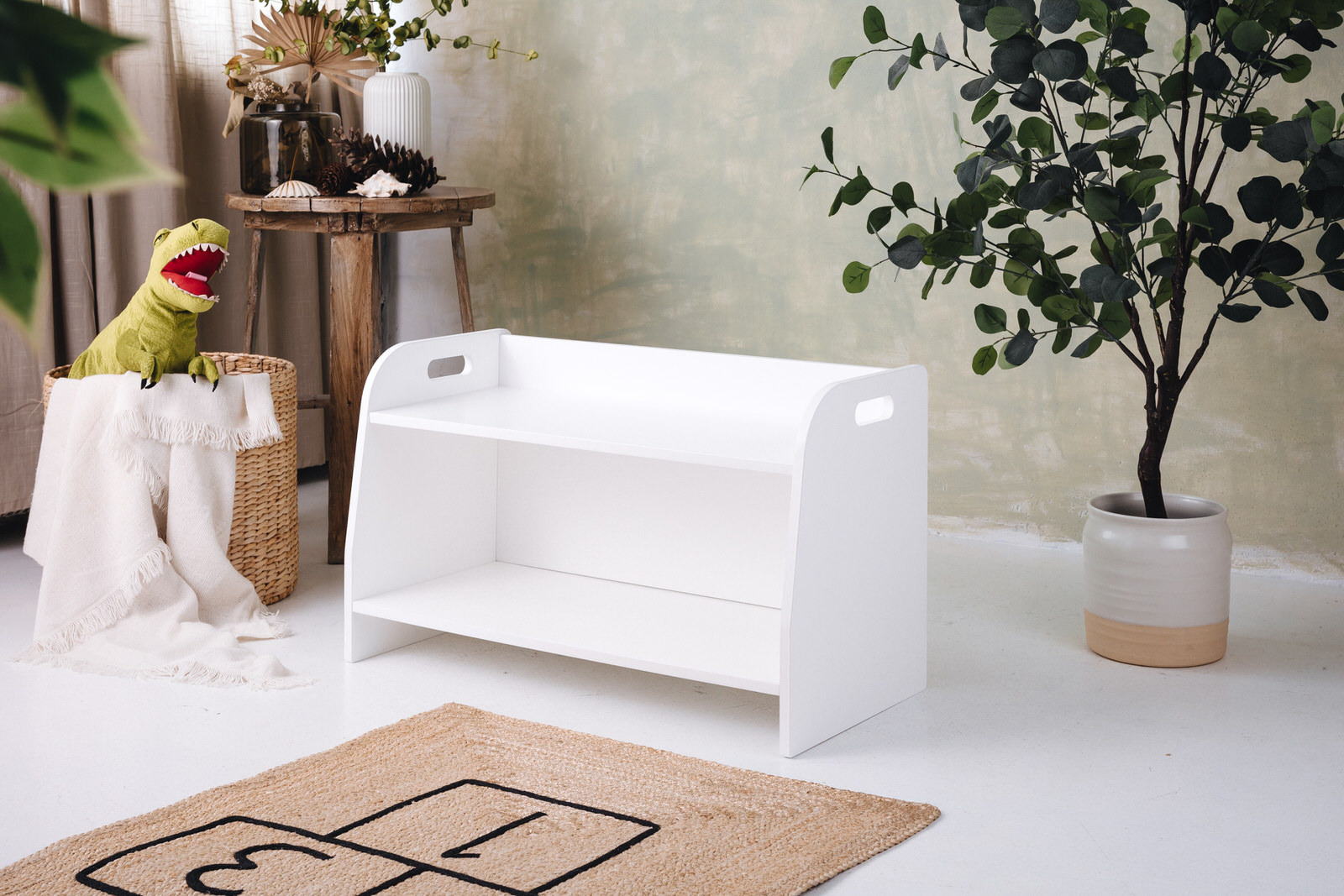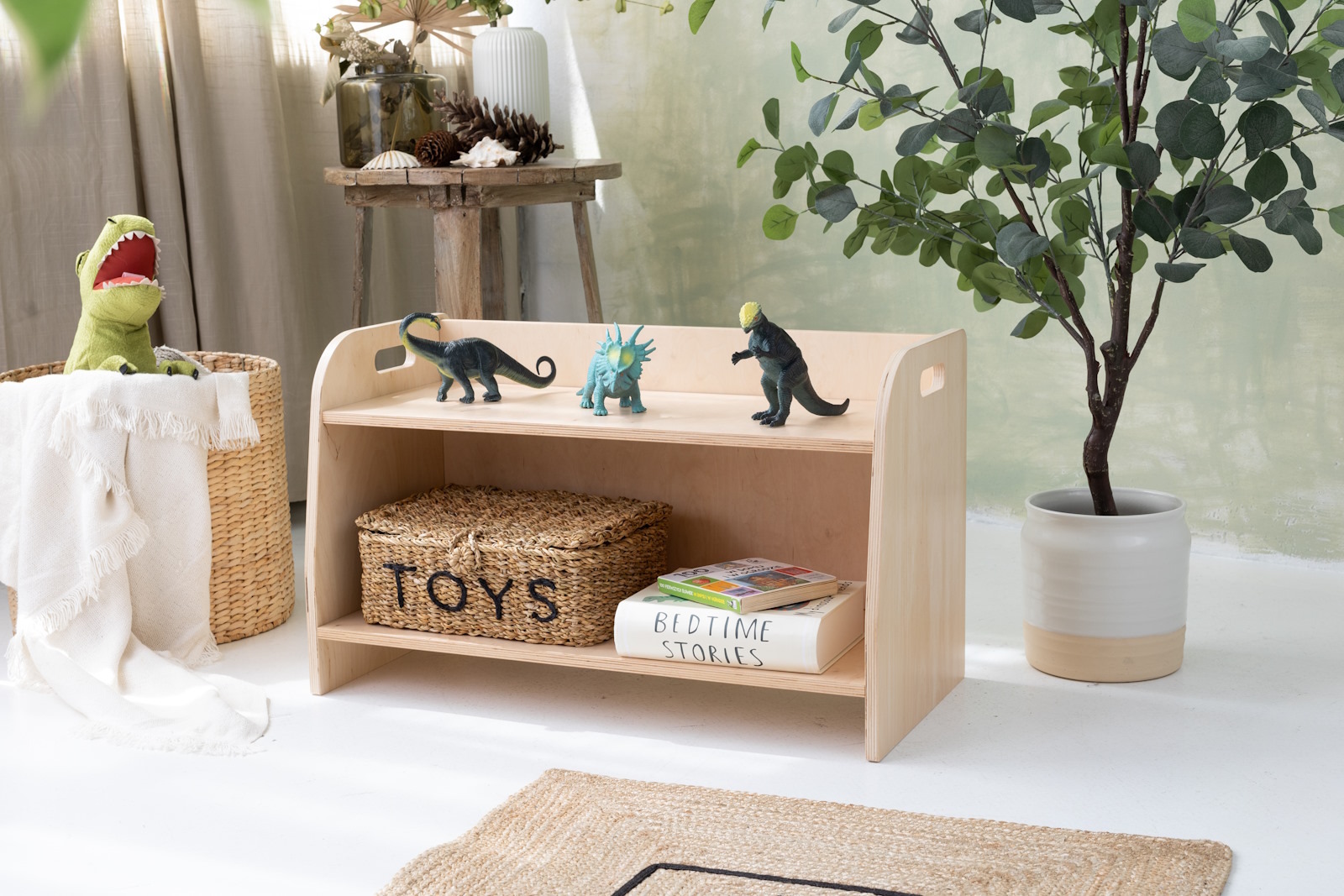 Das Spielzeugregal hat zwei Regale, auf die das Kind uneingeschränkten Zugriff hat. Das Möbel steht direkt auf dem Boden und misst nur 44 cm in der Höhe.