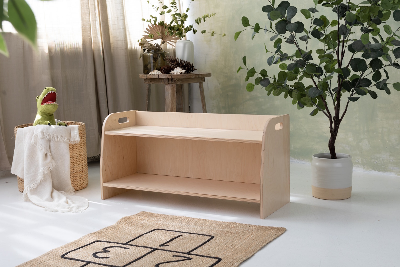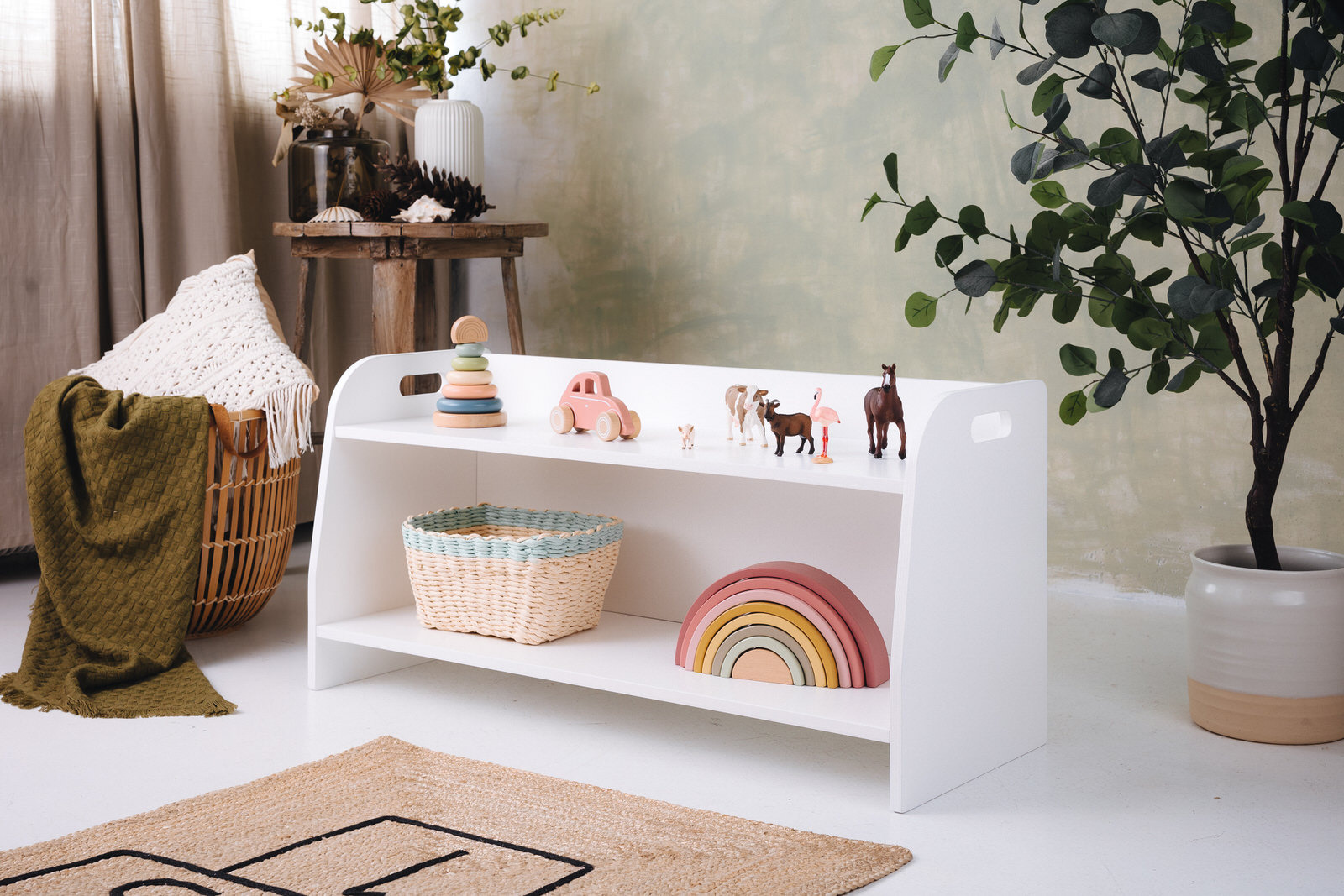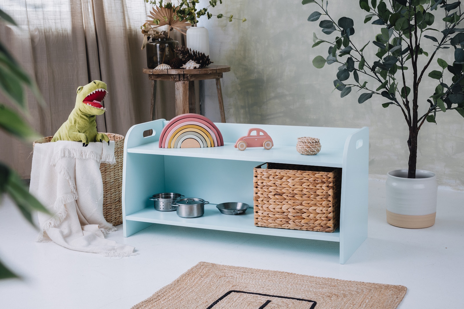 Das Spielzeugregal hat zwei Regale, auf die das Kind uneingeschränkten Zugriff hat. Das Möbel steht direkt auf dem Boden und misst nur 44 cm in der Höhe.