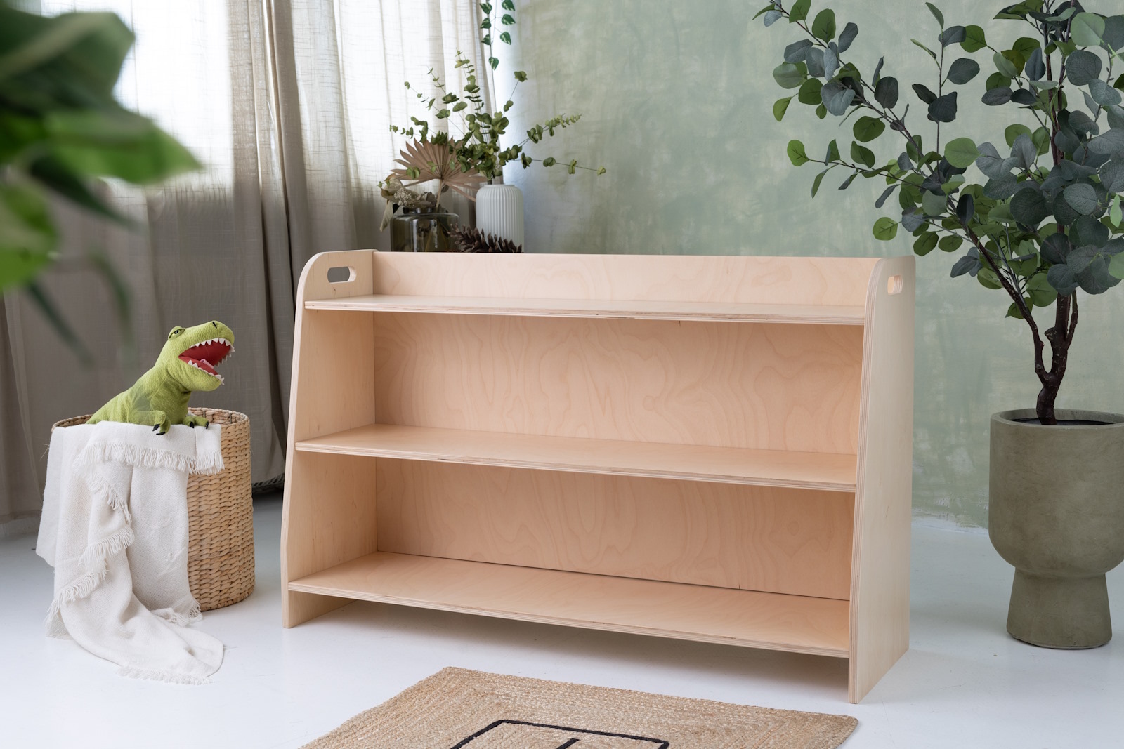 Das Spielzeugregal verfügt über drei Regale, auf die das Kind uneingeschränkten Zugriff hat. Das Möbelstück steht direkt auf dem Boden und misst nur 70 cm in der Höhe.