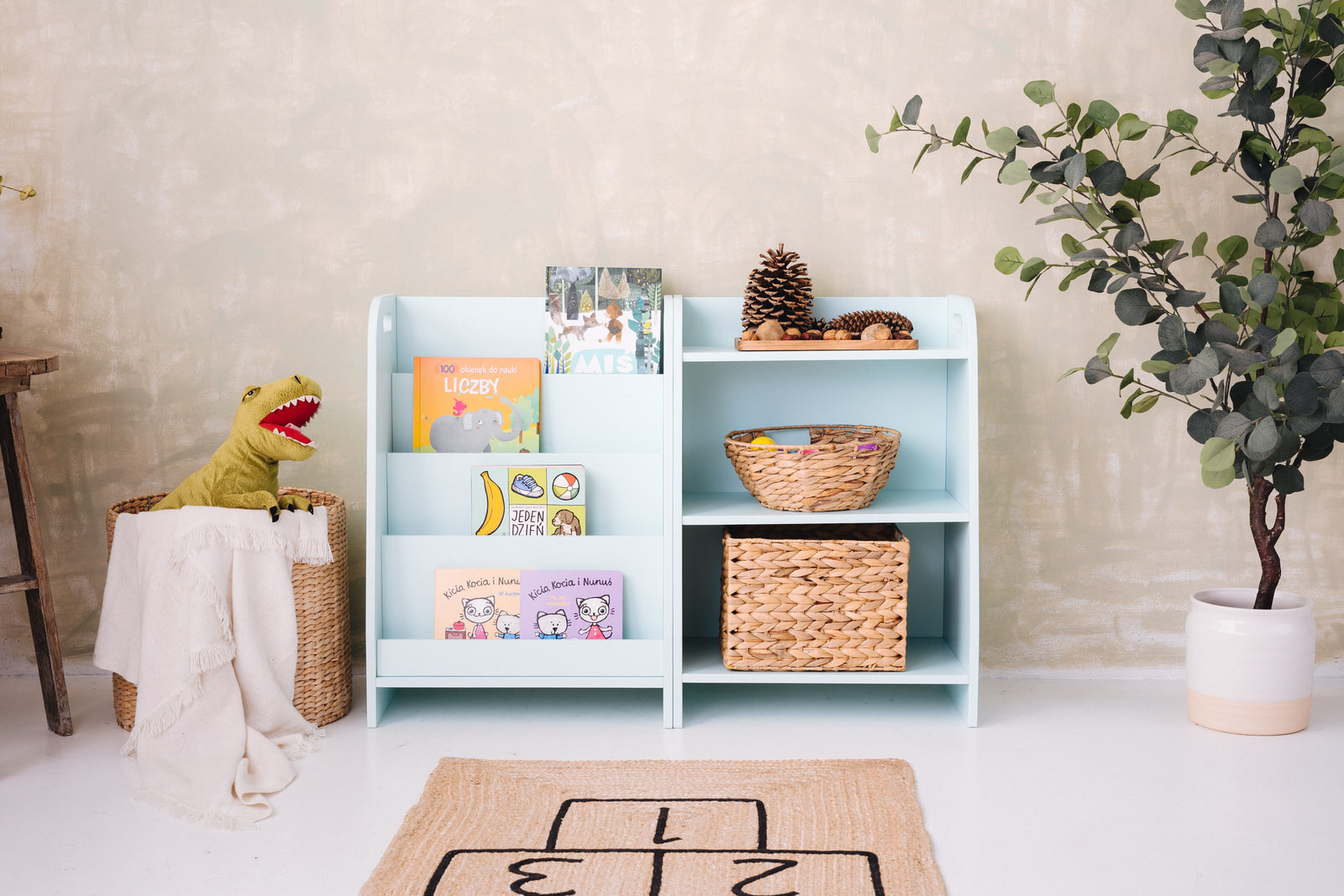 Das Spielzeugregal wurde in Handarbeit aus 15 mm dickem Sperrholz aus Hartholz gefertigt. Es wurde vollständig mit umweltfreundlichen und für Kinder sicheren Farben bemalt und erfüllt die Anforderungen der europäischen Norm PN EN 71.3, unter anderem.