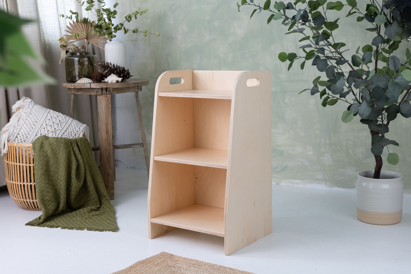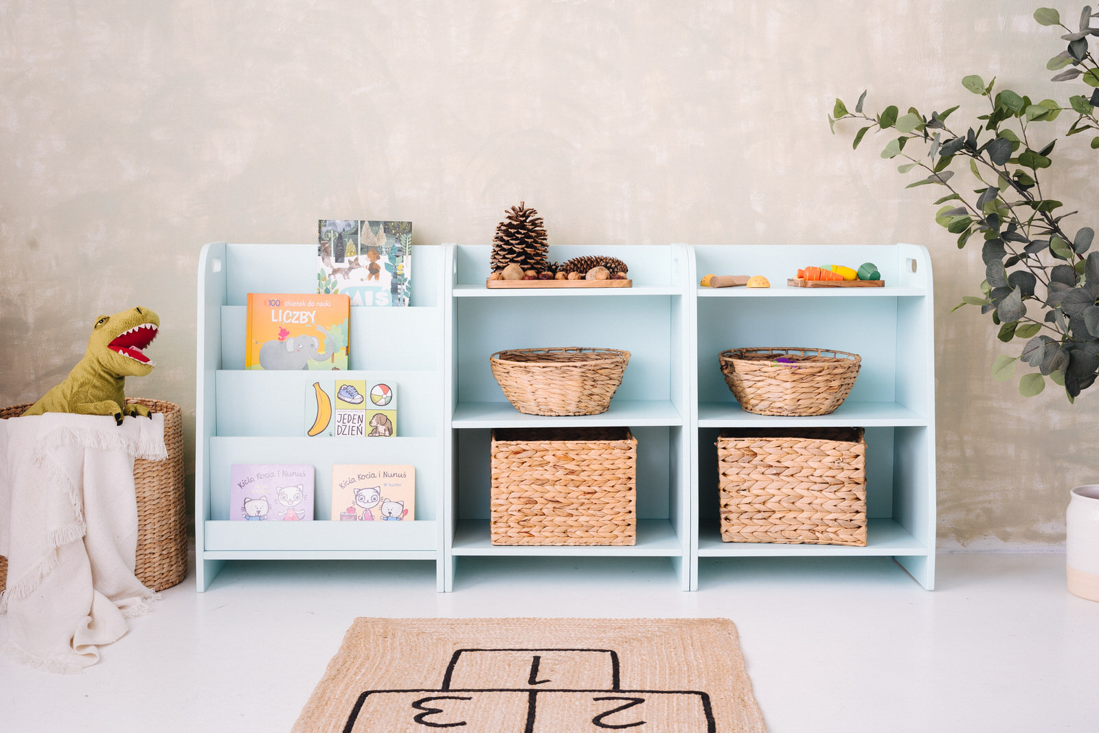 Das Spielzeugregal verfügt über drei Regale, auf die das Kind uneingeschränkten Zugriff hat. Das Möbelstück steht direkt auf dem Boden und misst nur 70 cm in der Höhe.