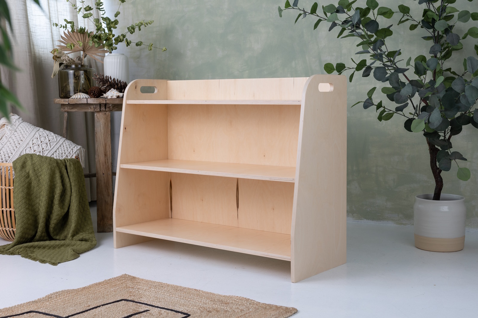 Das Spielzeugregal verfügt über drei Regale, auf die das Kind uneingeschränkten Zugriff hat. Das Möbelstück steht direkt auf dem Boden und misst nur 70 cm in der Höhe.