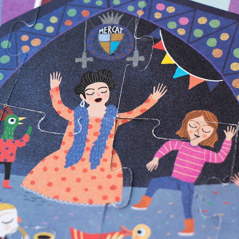 Auf einer Seite des Puzzles feiern wir den Tag von Sant Jordi. Beim Spaziergang entlang der Ramblas bis zum Boqueria-Markt können wir die Sagrada Familia und Tibidabo sehen. Die Stadt ist voller Bücher und Rosen, die wir den Menschen schenken, die wir lieben.
