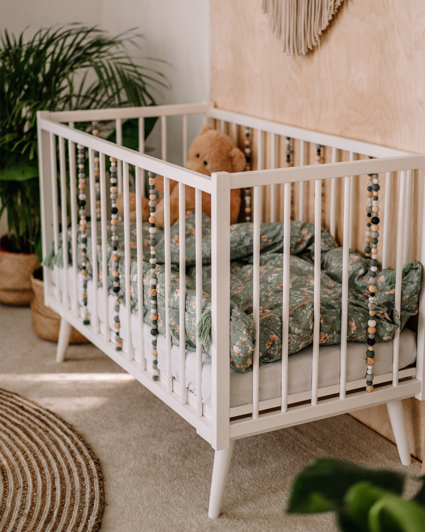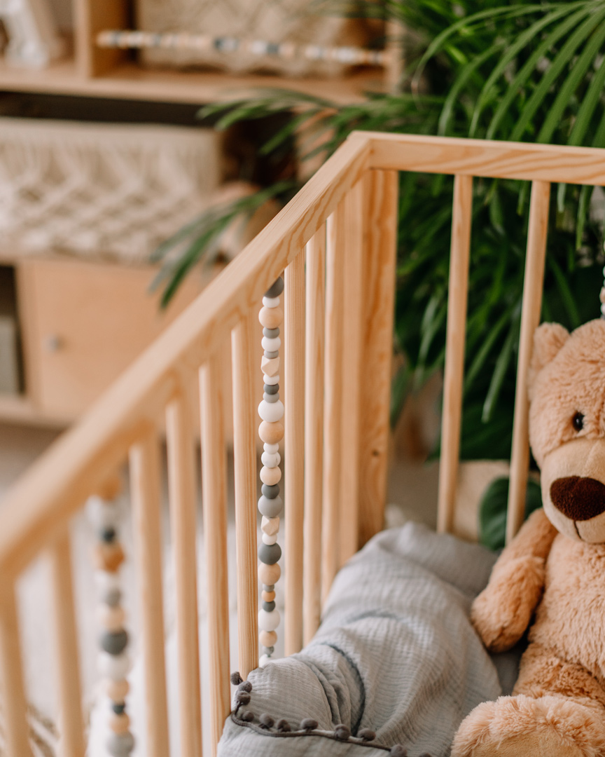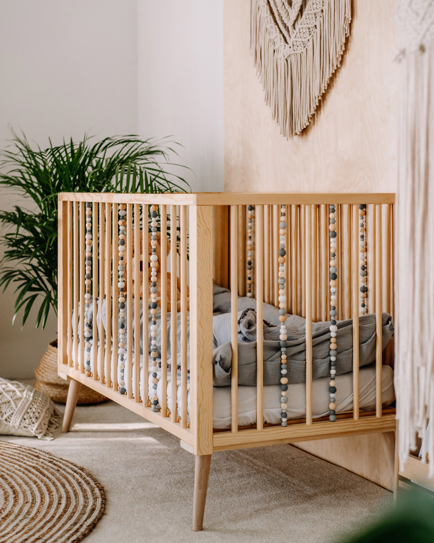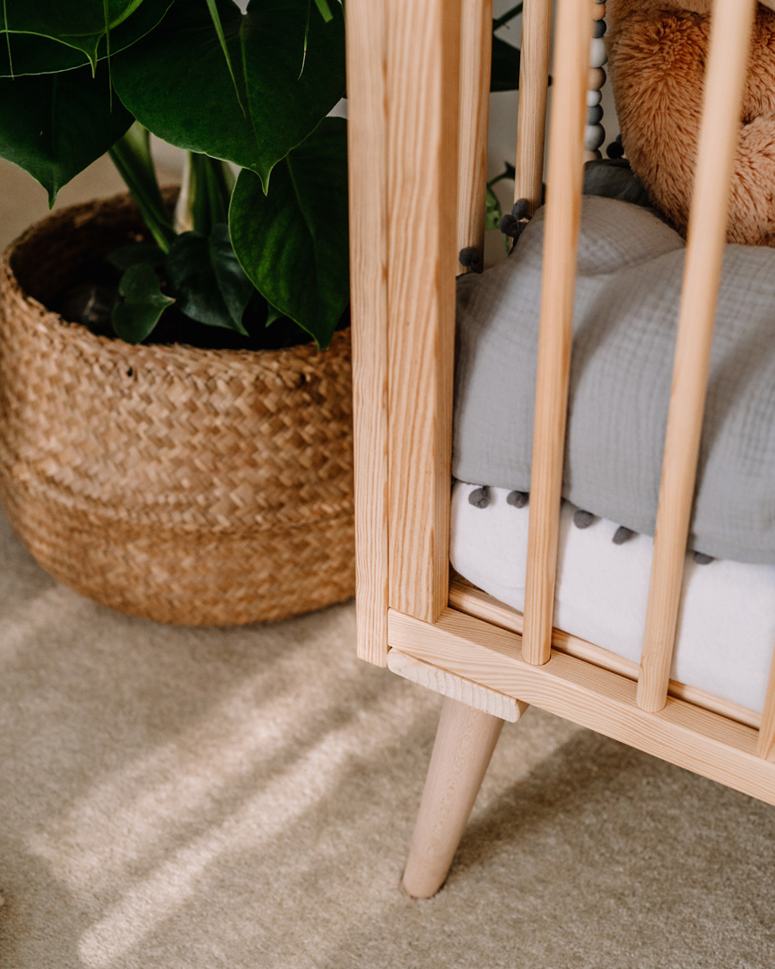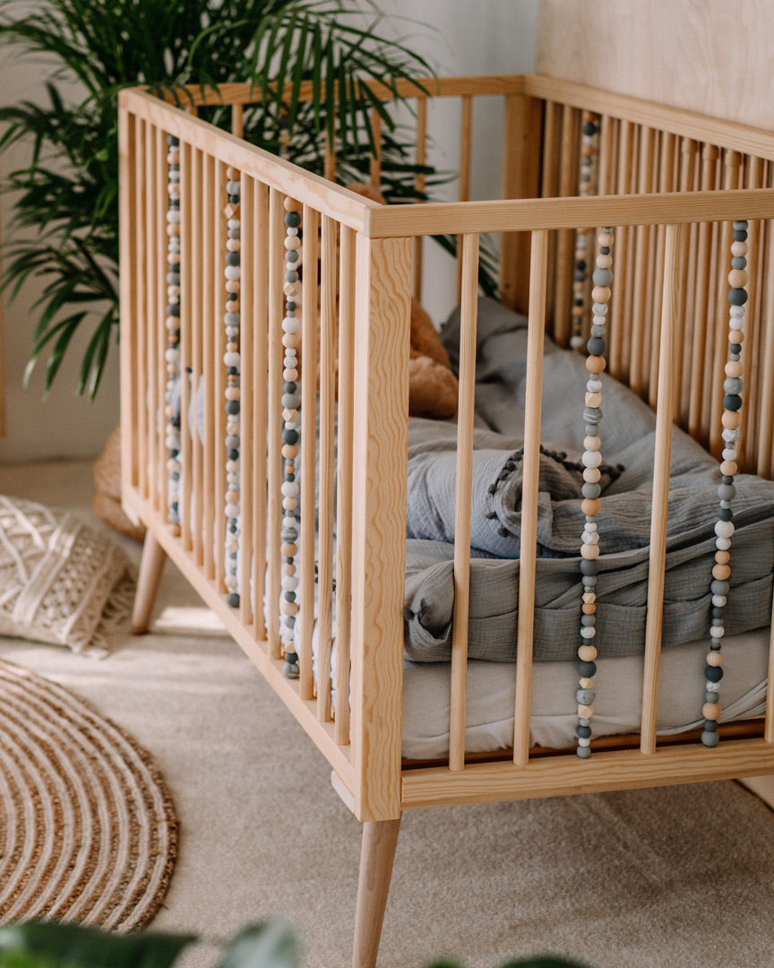 Zusätzlich verfügt das Bett über abnehmbare Stäbe, die älteren Kindern das selbstständige Ein- und Aussteigen ermöglichen, während ein versehentliches Entfernen verhindert wird. Hergestellt aus Naturholz, zeichnet sich das Bett durch ein einfaches, universelles Design aus, das zu verschiedenen Einrichtungsstilen wie Boho und skandinavisch passt.