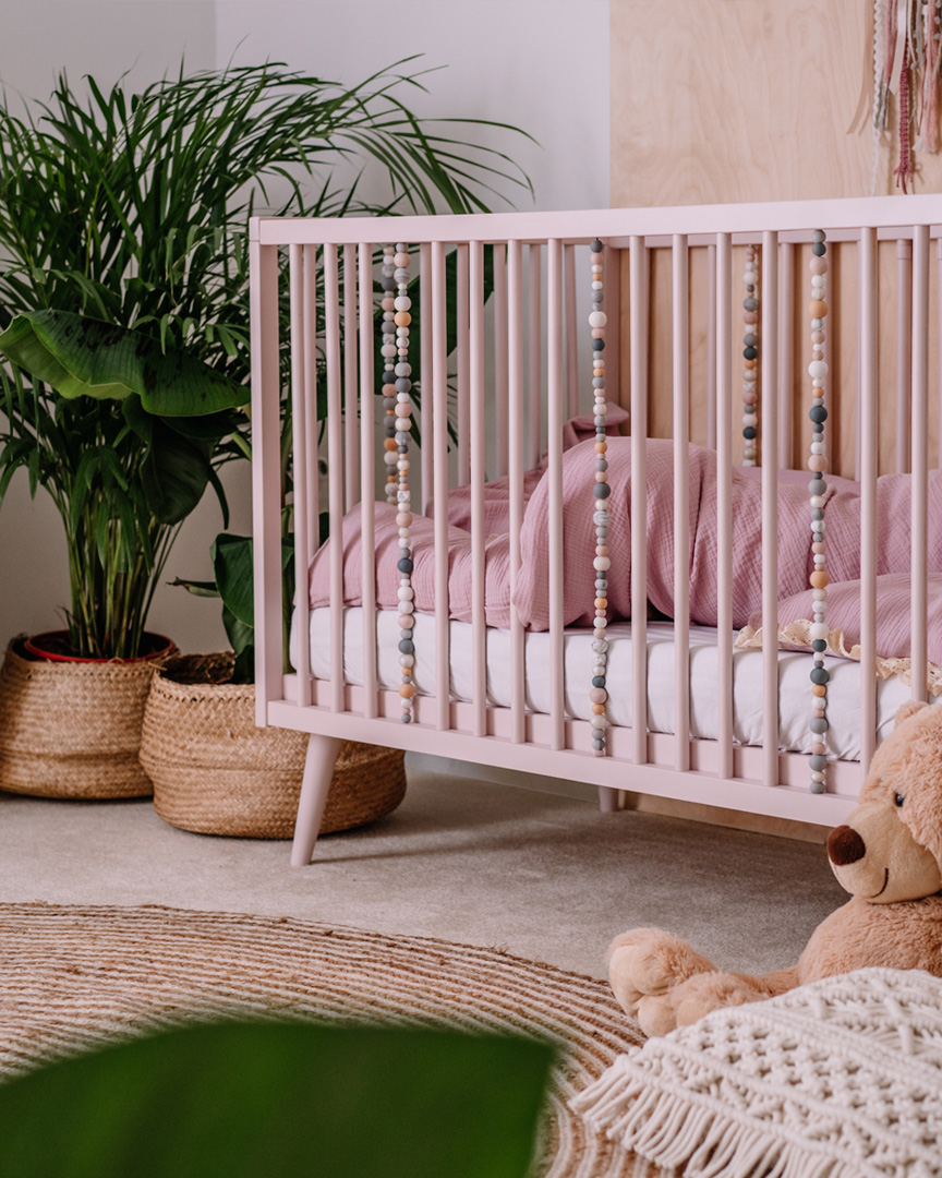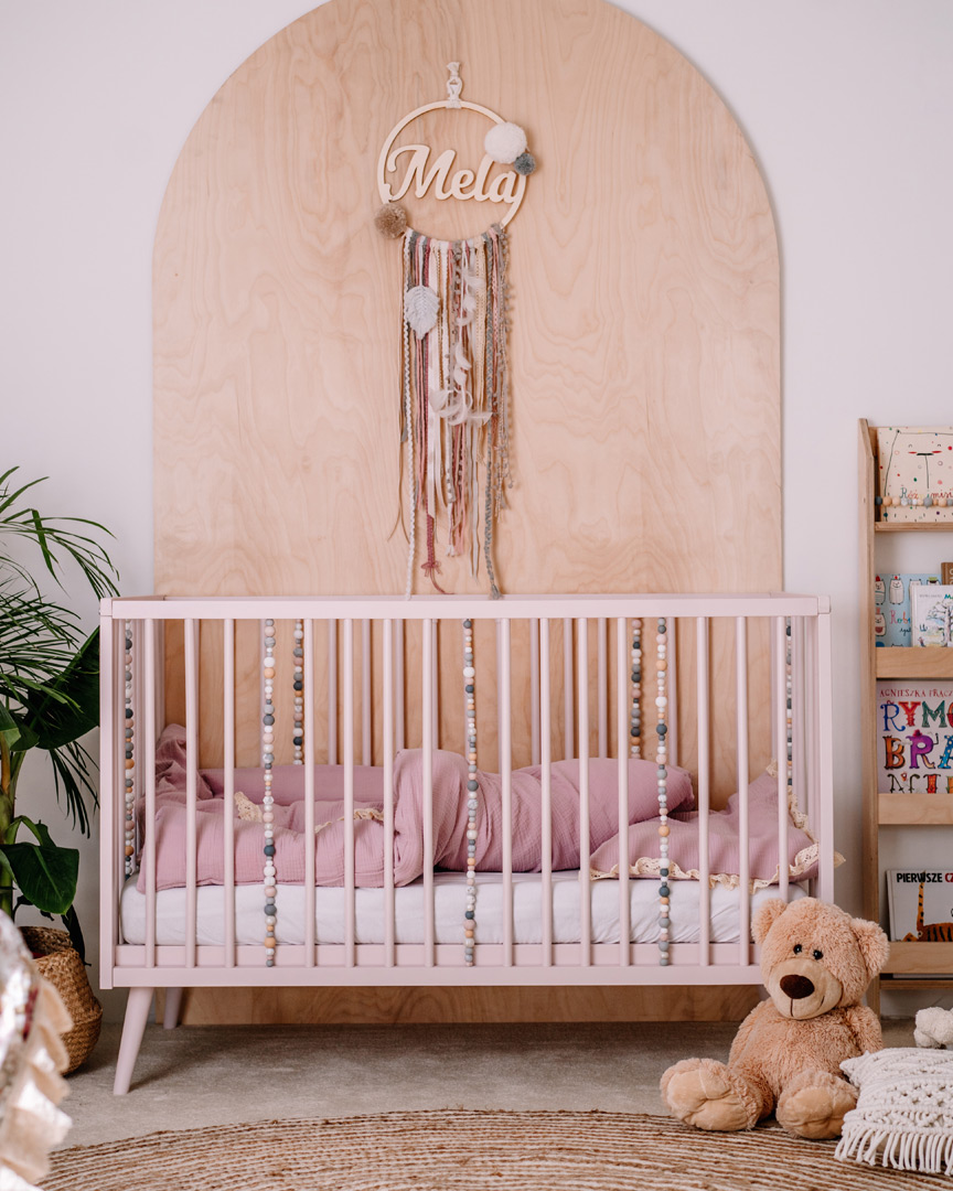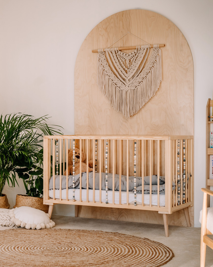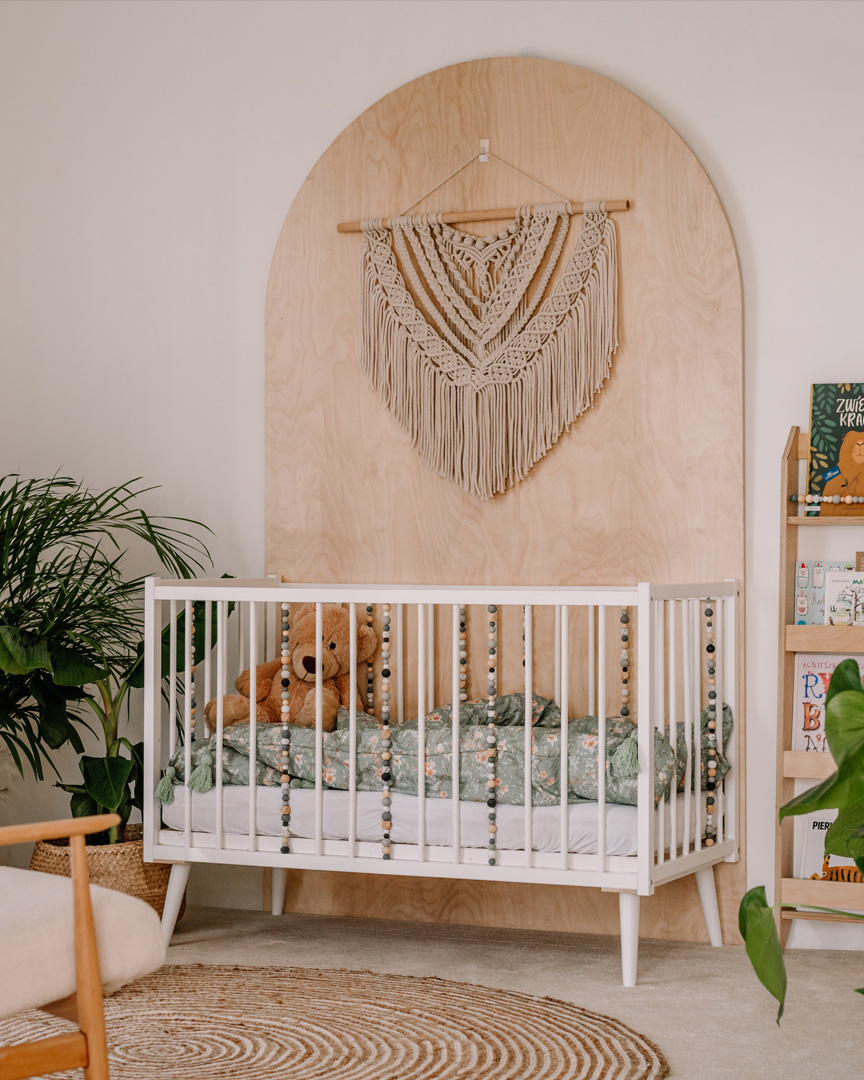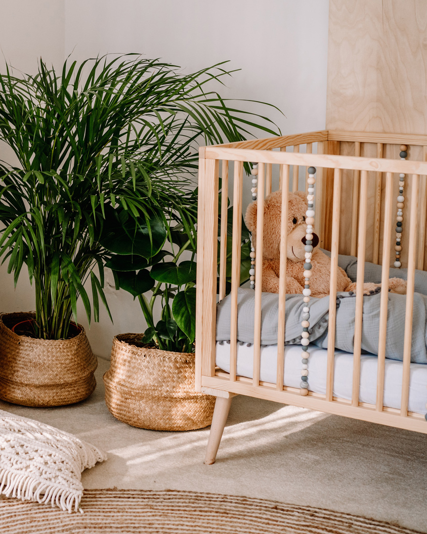 Zusätzlich verfügt das Bett über abnehmbare Stäbe, die älteren Kindern das selbstständige Ein- und Aussteigen ermöglichen, während ein versehentliches Entfernen verhindert wird. Hergestellt aus Naturholz, zeichnet sich das Bett durch ein einfaches, universelles Design aus, das zu verschiedenen Einrichtungsstilen wie Boho und skandinavisch passt.