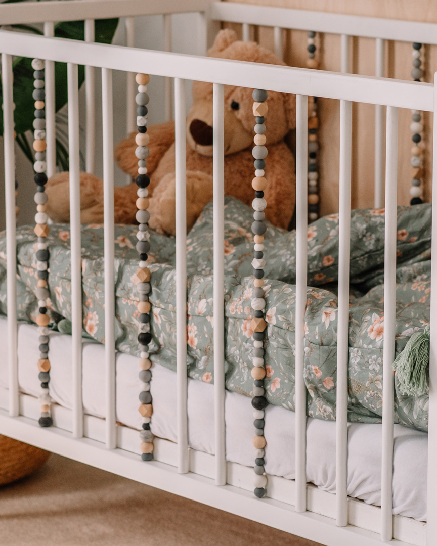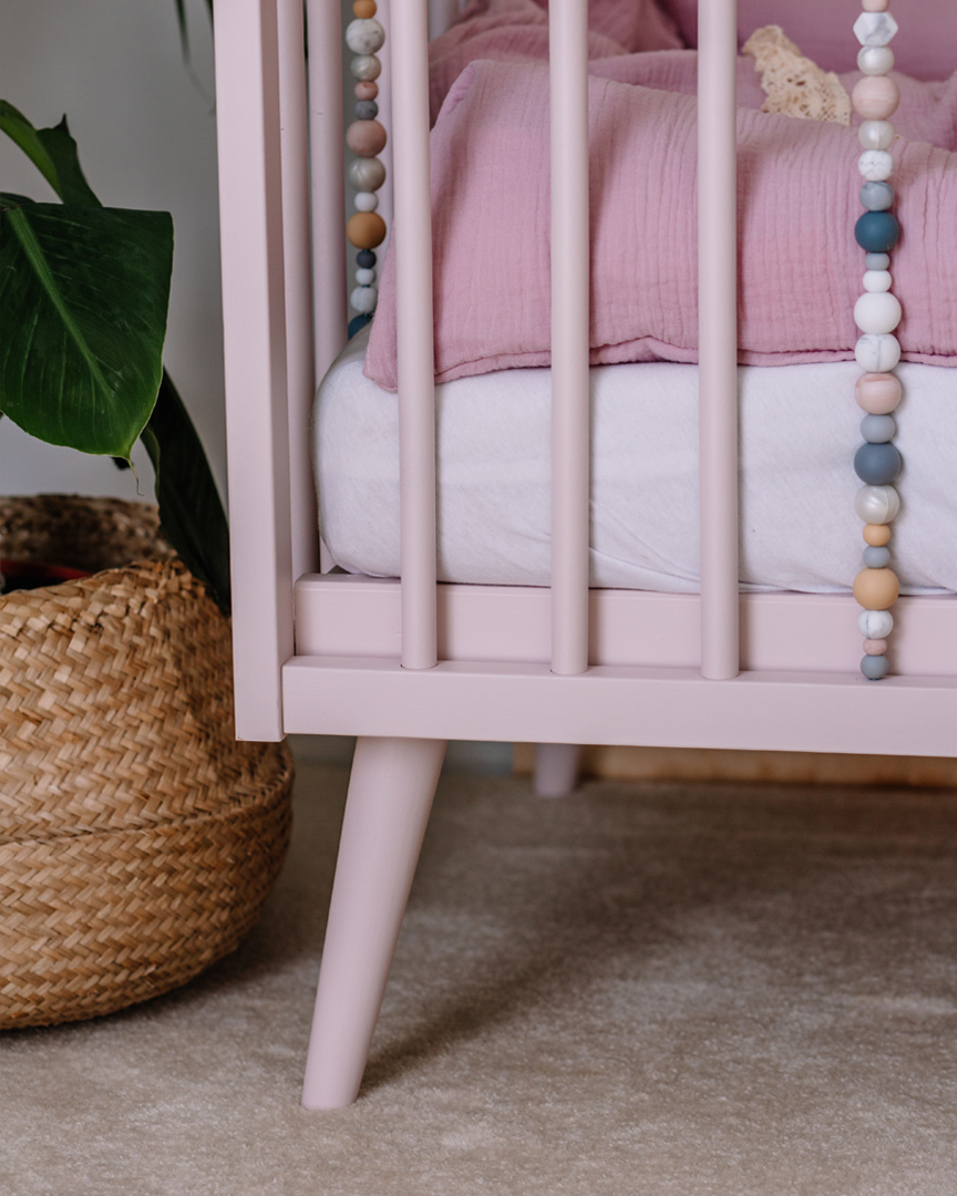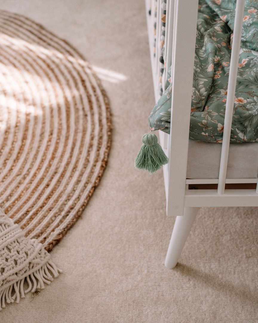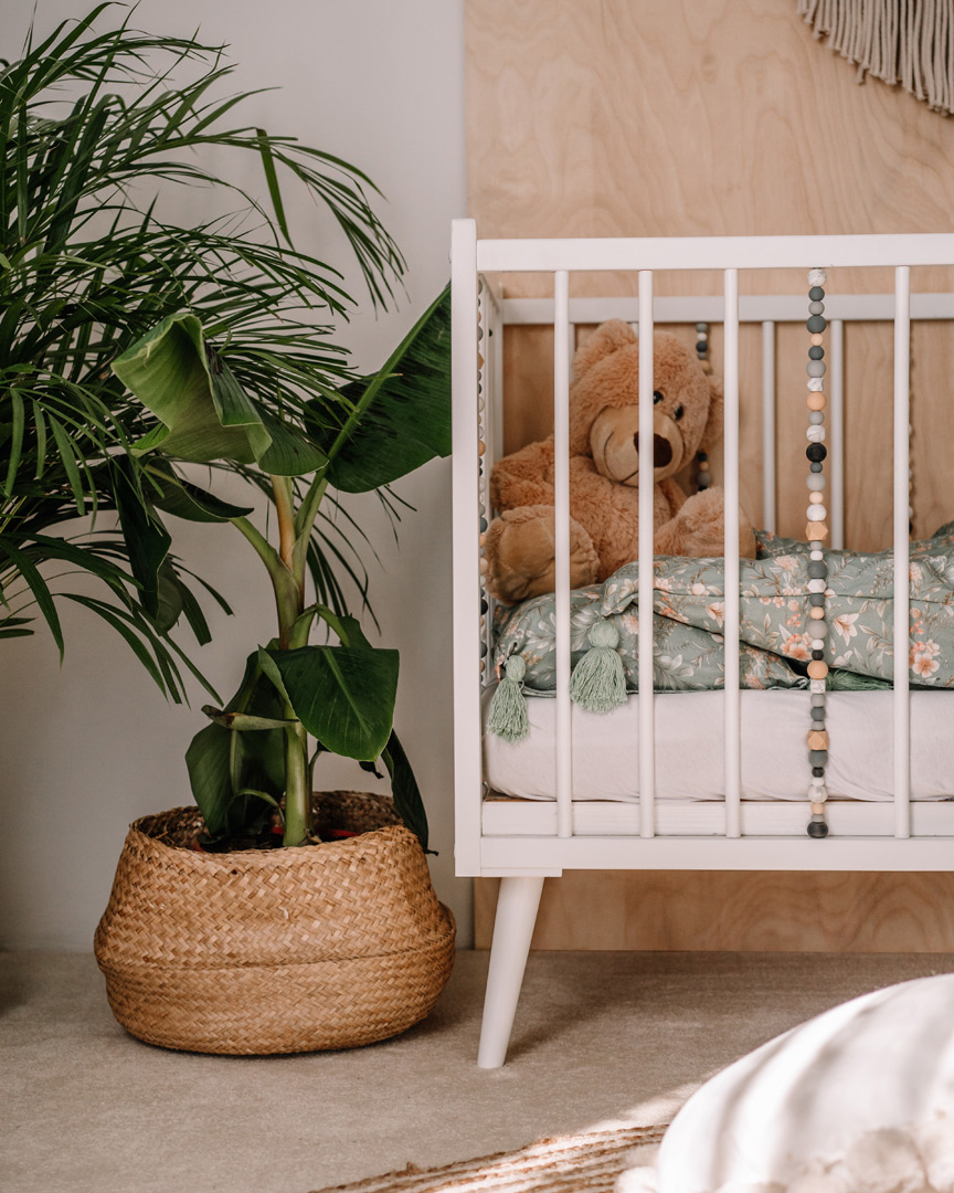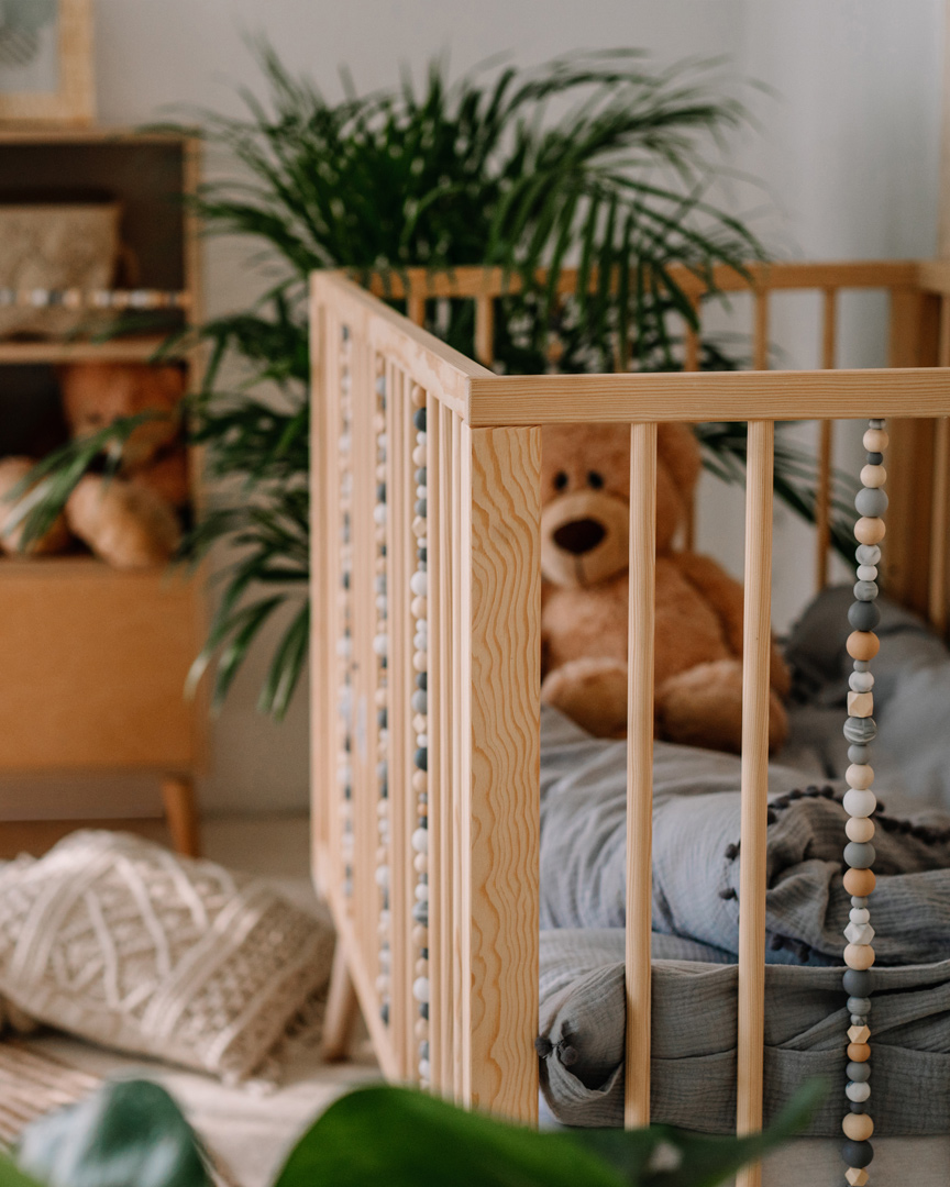 Zusätzlich verfügt das Bett über abnehmbare Stäbe, die älteren Kindern das selbstständige Ein- und Aussteigen ermöglichen, während ein versehentliches Entfernen verhindert wird. Hergestellt aus Naturholz, zeichnet sich das Bett durch ein einfaches, universelles Design aus, das zu verschiedenen Einrichtungsstilen wie Boho und skandinavisch passt.
